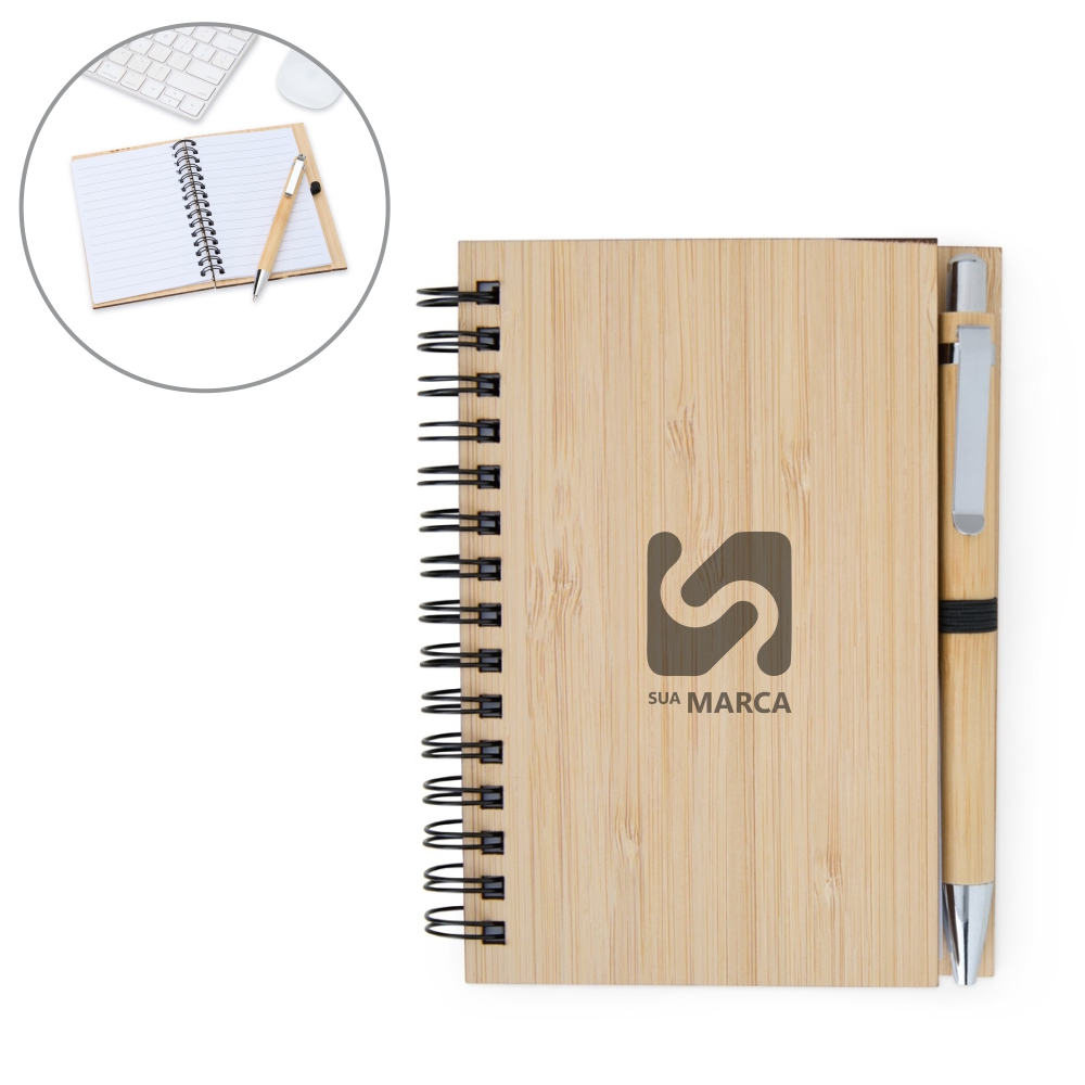 Descrição: Bloco de anotações ecológico com caneta. Capa de bambu. Possui aproximadamente 50 folhas brancas pautadas. Acompanha uma caneta de bambu com detalhes em metal.