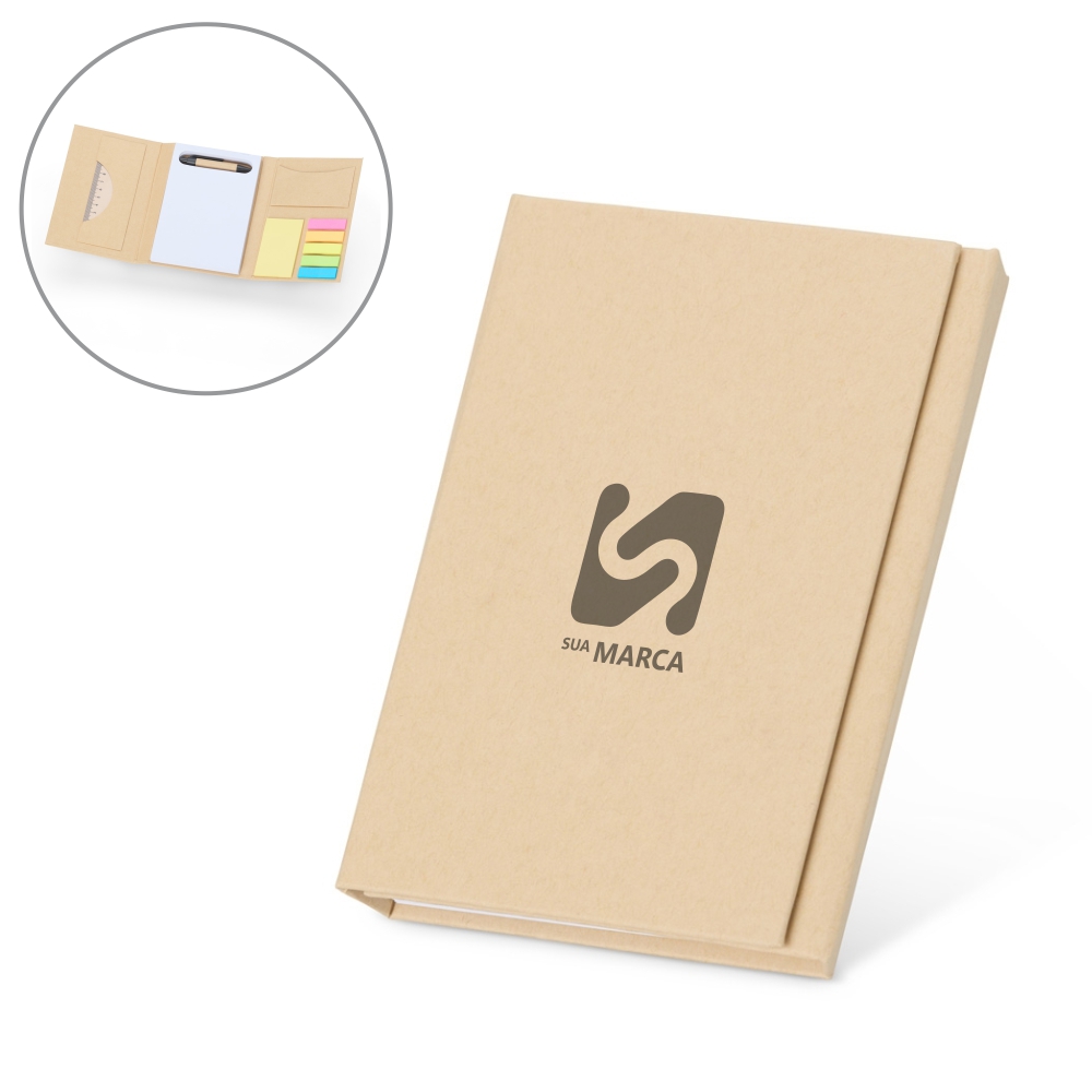 Descrição: Bloco de Anotações Ecológico, material em kraft. Possui notas autoadesivas, aproximadamente 25 folhas, bloco autoadesivo amarelo com aproximadamente 25 folhas, compartimento para guardar anotações, uma régua em material plástico de 12 cm, caneta de papelão e bloco grande com aproximadamente 100 folhas.