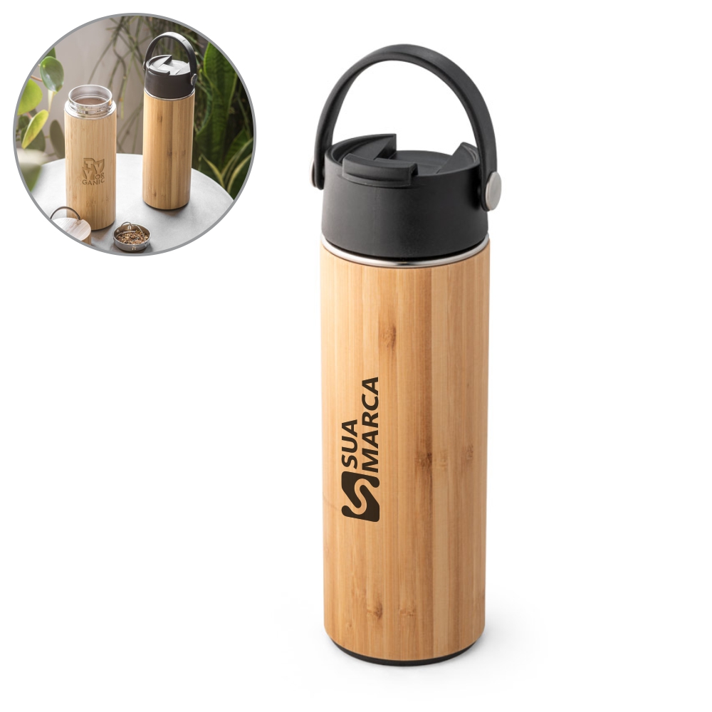 Squeeze em bambu e aço inox com corpo duplo, isolamento a vácuo e tampa em PP. Capacidade até 440 ml. Food grade. Fornecido em caixa presente de papel craft. ø70 x 222 mm.