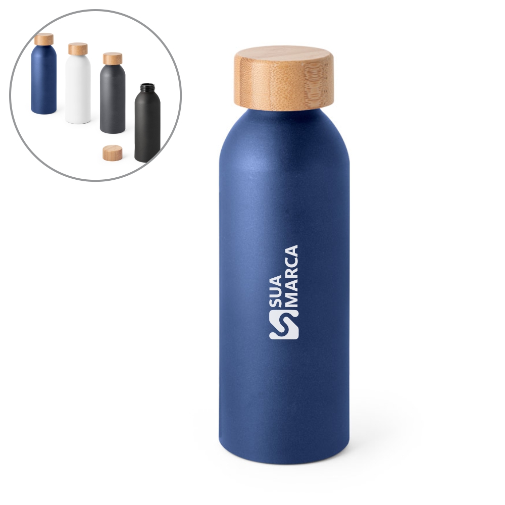 Squeeze de alumínio com acabamento mate e tampa em bambu. Capacidade até 550 ml. Food grade. Caixa branca 94656 vendida opcionalmente. ø65 x 197 mm.