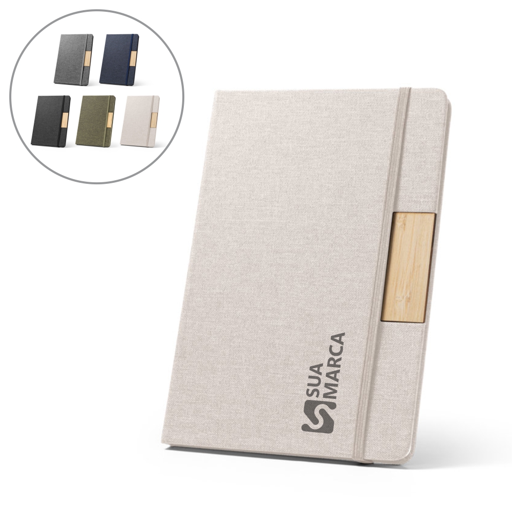 Caderno A5 de capa dura em tecido poliéster 100% reciclado (100% rPET) e detalhe em bambu. O interior contém 80 folhas pautadas em papel cor marfim reciclado, fita separadora e elástico para fecho do caderno. A cor e o resultado da impressão nos materiais naturais pode variar entre produtos. 146 x 210 mm