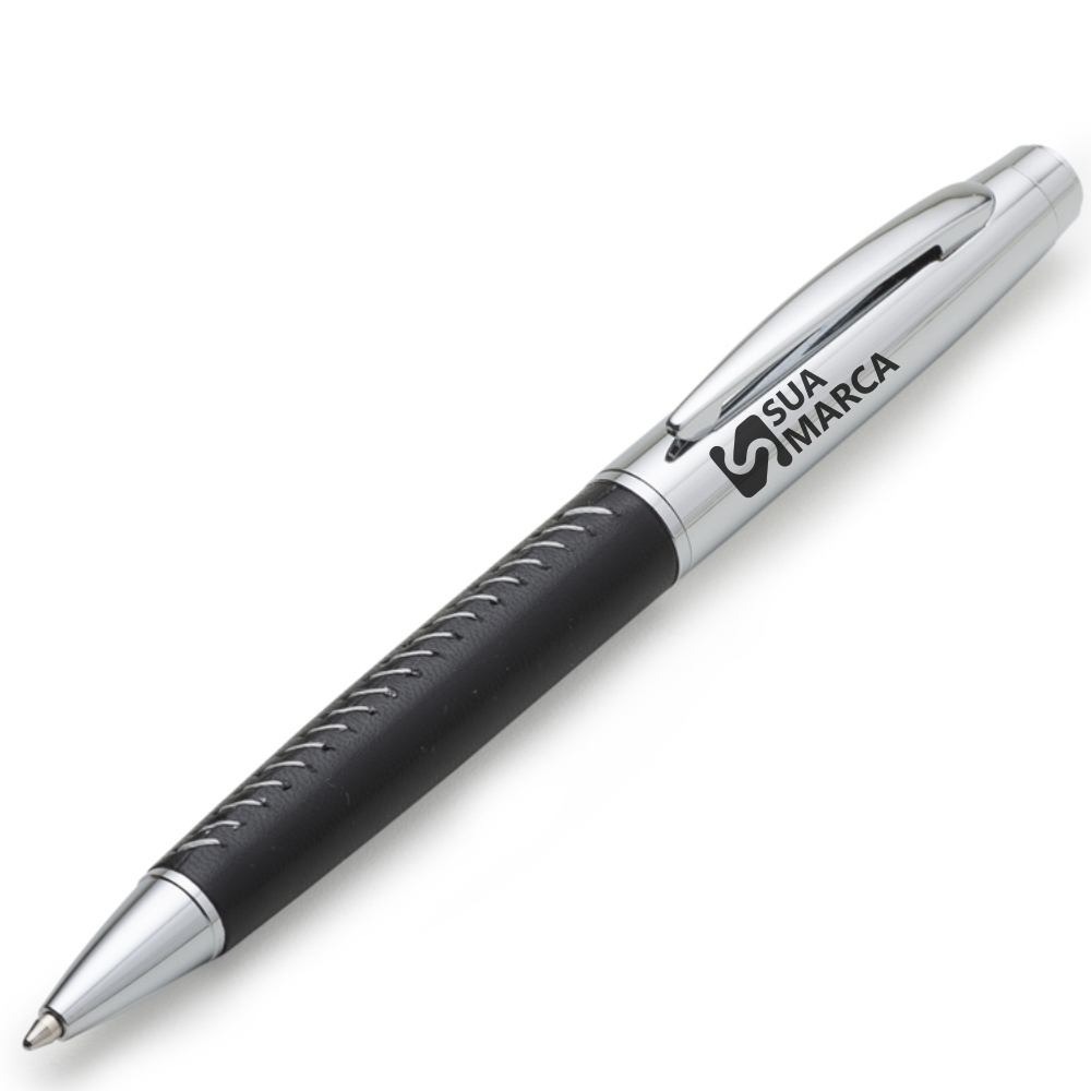 Caneta metálica com acabamento brilhante, versões em couro sintético e fibra preta. Carga esferográfica azul e acionamento por rotação.