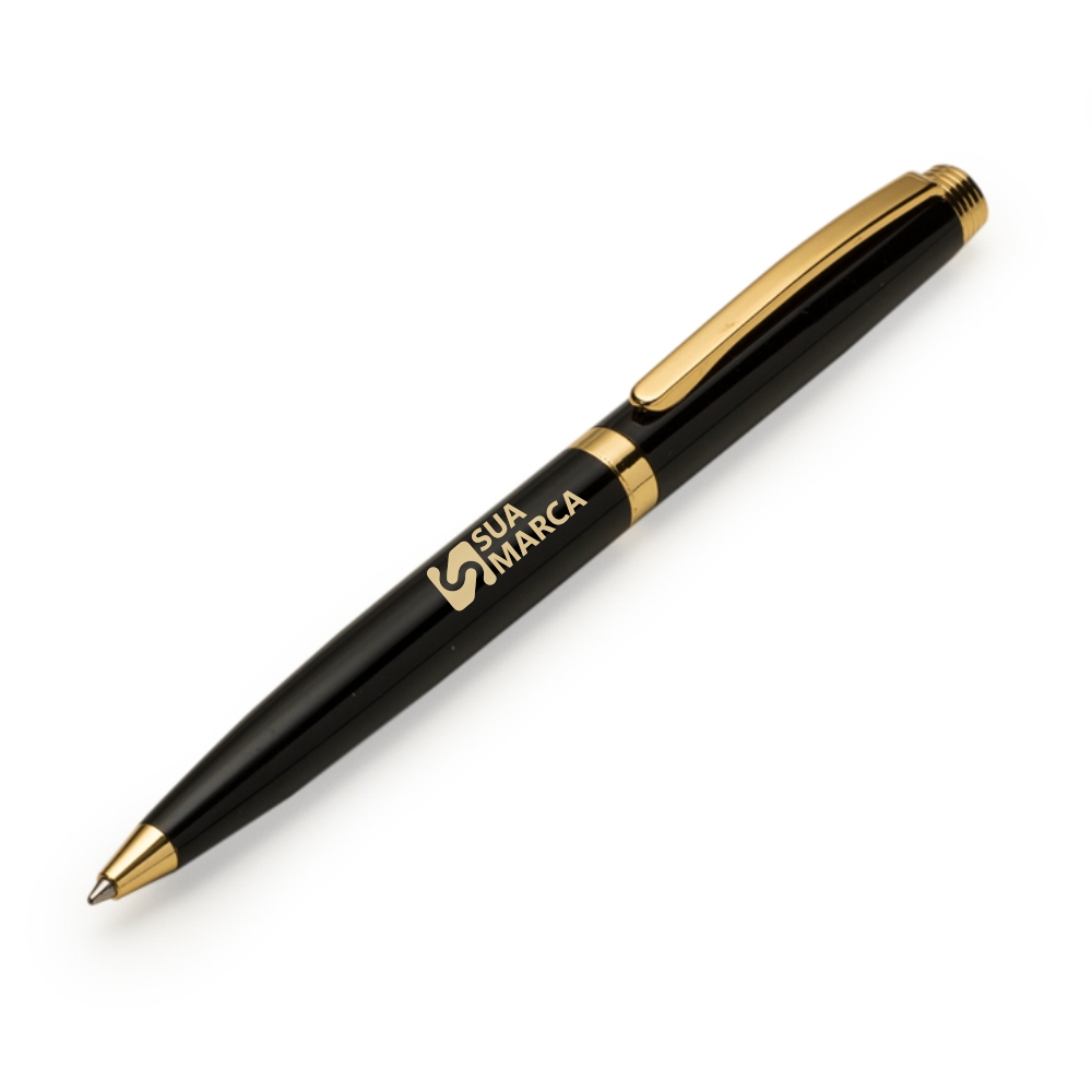 Caneta metal preta com detalhes dourados. Clip metal com quatro anéis em relevo no suporte dourado e na ponta superior possui um cristal. Anel central e ponteira dourada, aciona por giro.