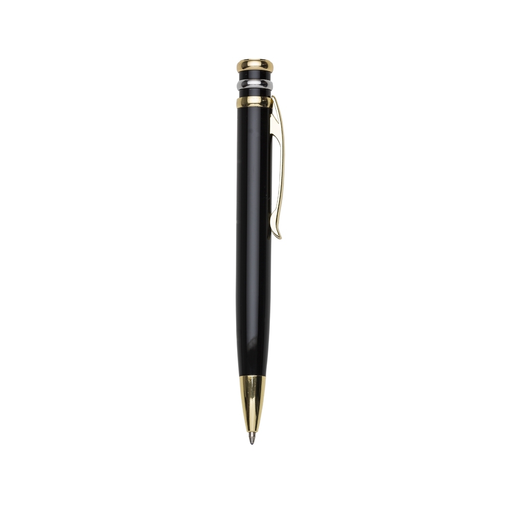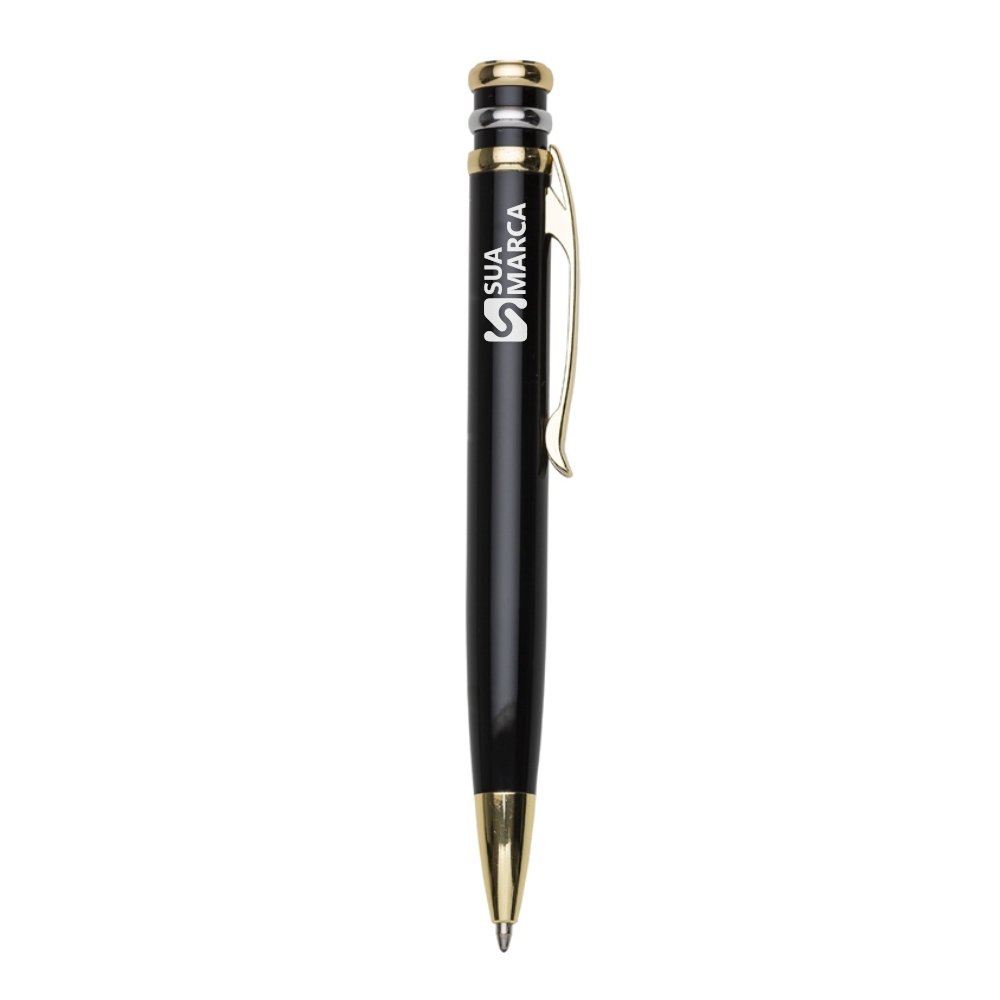 Caneta metal inteira colorida com detalhes dourado. Clip metal dourado com 3 anéis, sendo dois dourados e o central prata. Ponteira dourada, aciona por giro.