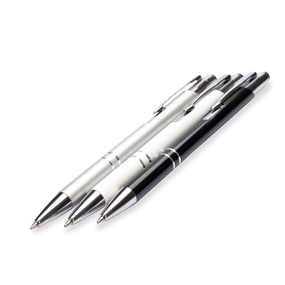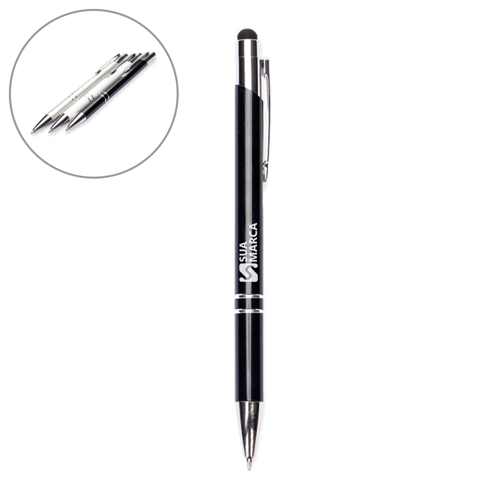 Descrição: Caneta esferográfica de carga azul de 1,0mm. Possui construção inteira em metal e acionamento por clique que proporciona um toque leve para escrita. Além disso, sua ponteira emborrachada permite o uso como uma caneta touch para interação com dispositivos com telas touchscreen.