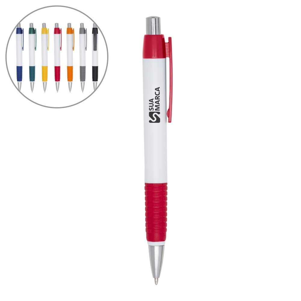 Caneta plástica corpo branco com detalhes coloridos. Clip plástico e detalhe inferior emborrachado com relevo, acionador e ponteira prateada(plástico). Aciona por clique.