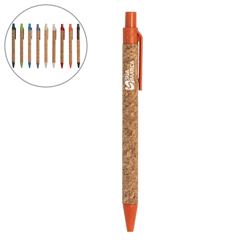 Descrição: Caneta de cortiça com carga esferográfica azul 1.0mm e acionamento por clique. Clipe plástico, acionador e ponteira plástica.
