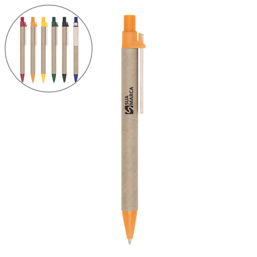Descrição: Caneta ecológica de papelão com detalhes coloridos. Clip de madeira e ponteira plástica, possui relevo na ponteira. Aciona por clique.