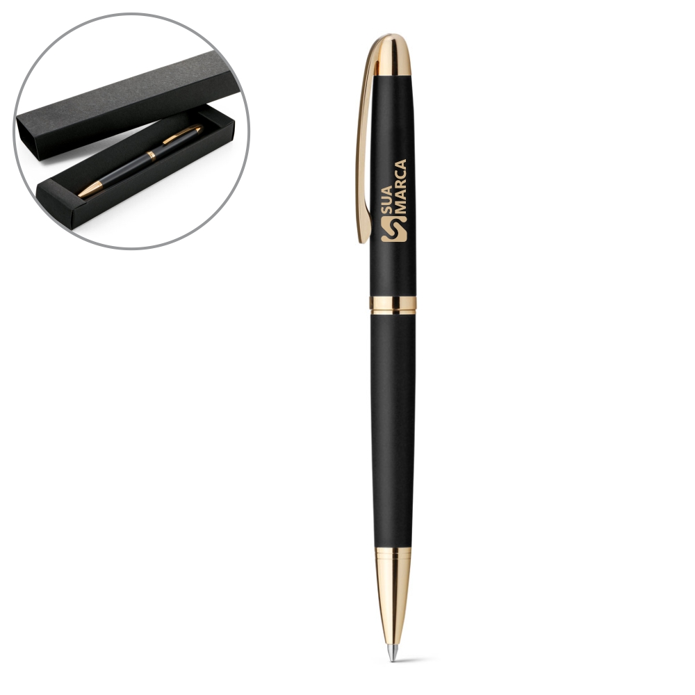 Esferográfica em metal com mecanismo twist, clipe e apontamentos em dourado. Fornecida em estojo em papel craft. ø11 x 139 | Caixa: 180 x 43 x 22 mm.