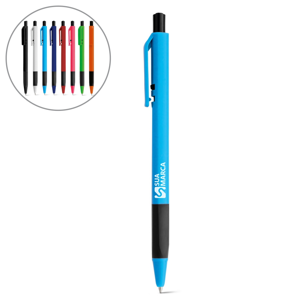 Esferográfica em ABS com grip, acabamento brilhante e corpo triangular. Até 1,5 km de escrita. ø9 x 141 mm.