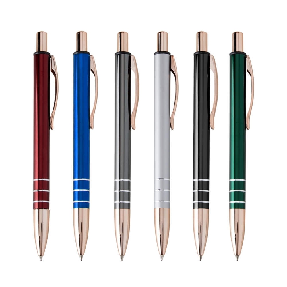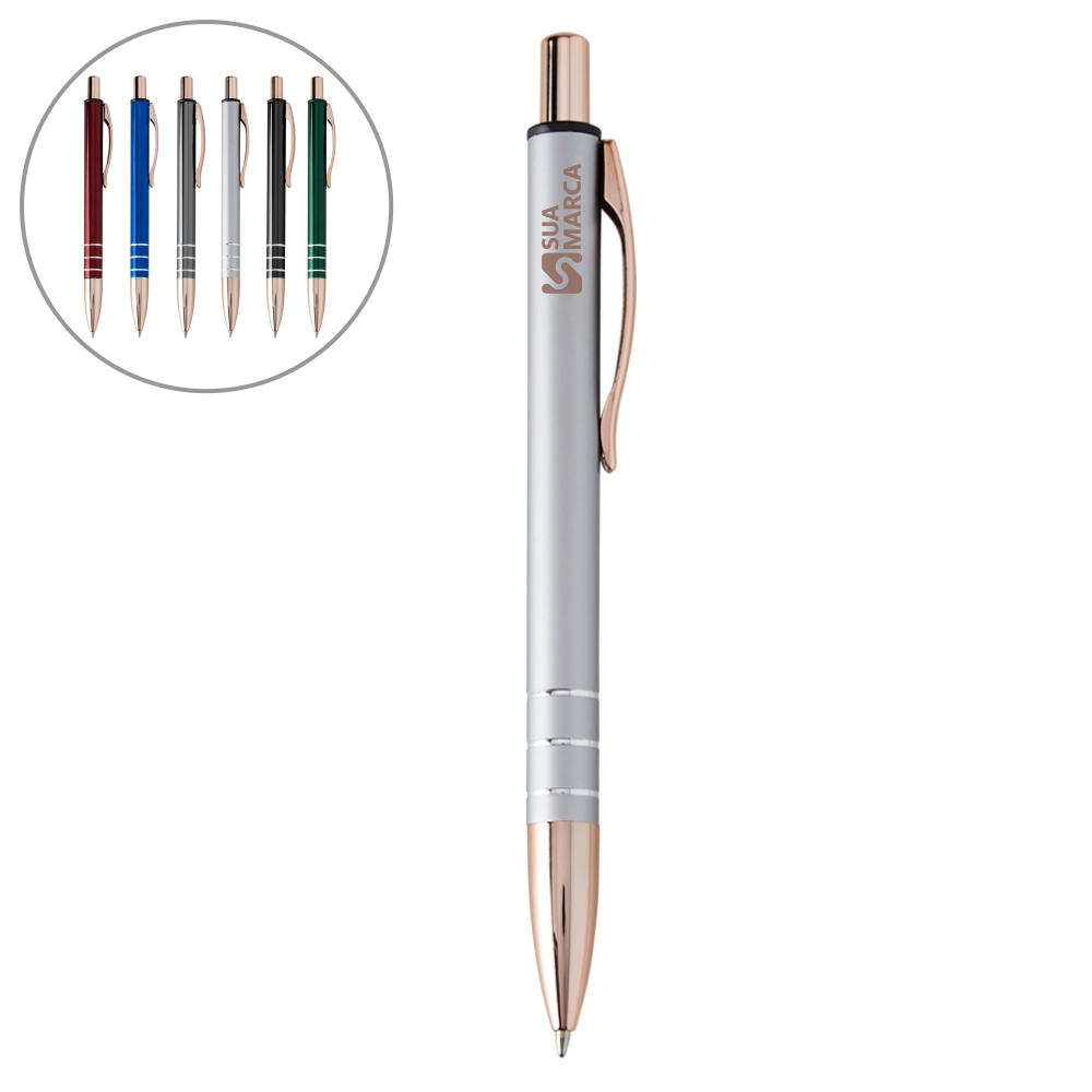 Caneta metálica com carga esferográfica azul 1.0mm e acionamento por clique.