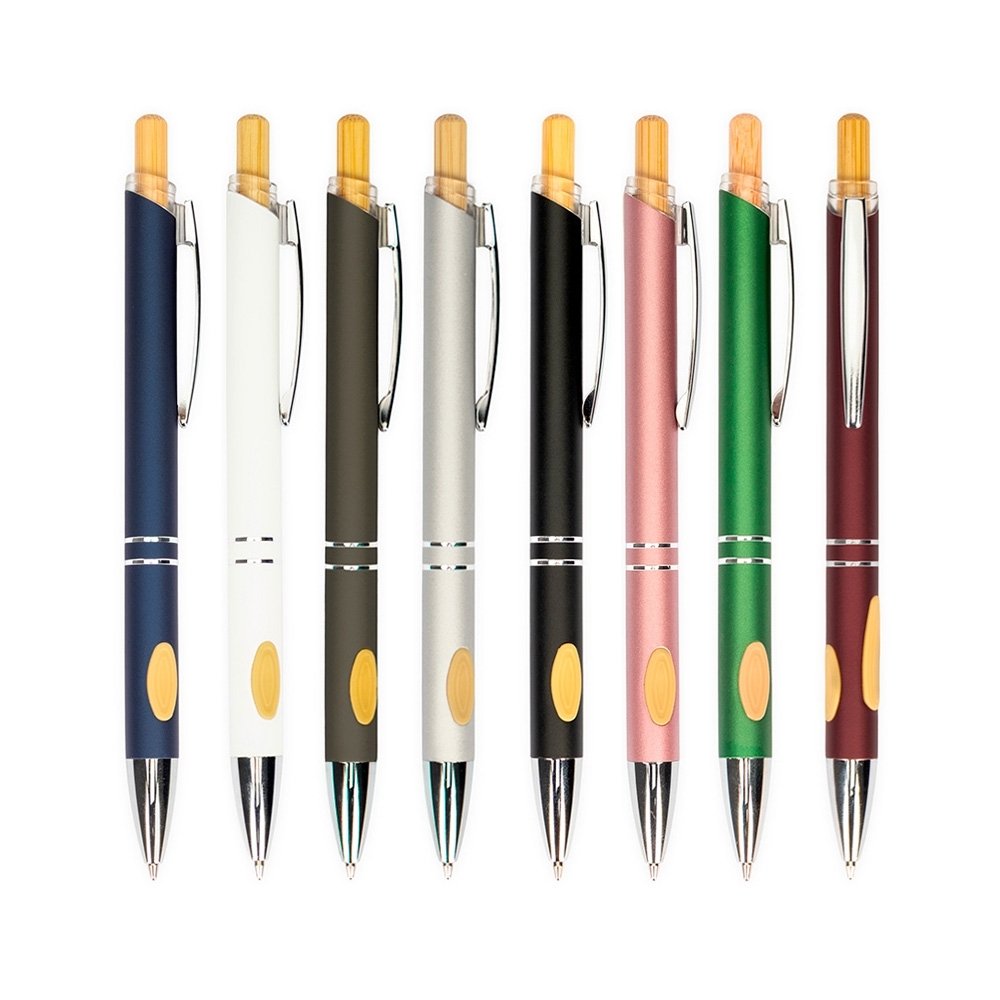 Caneta metálica com detalhes emborrachados no corpo, acionamento por clique com parte superior em bambu, carga esferográfica azul de 1.0mm, o que proporciona uma pegada leve e uma escrita precisa.