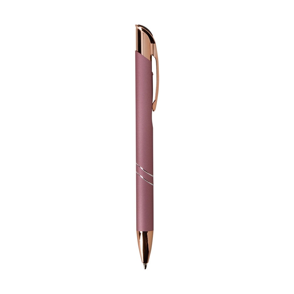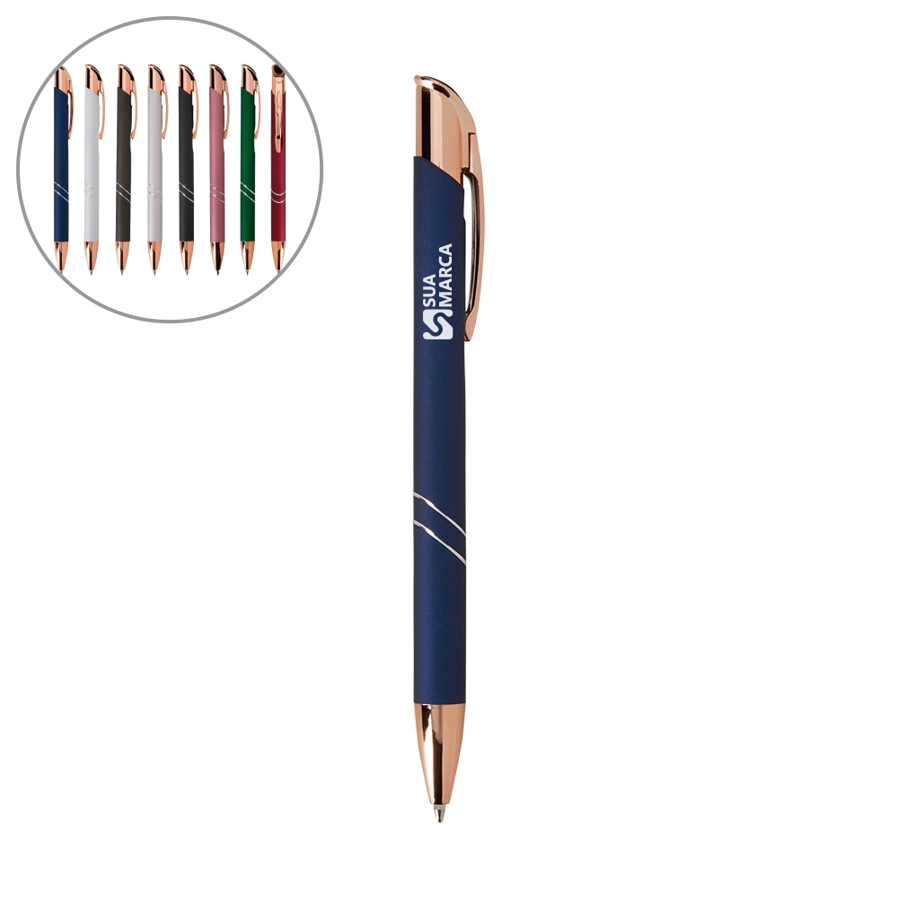 Caneta metálica com detalhes em plástico, acionamento por clique e carga esferográfica azul de 1.0mm, o que proporciona uma pegada leve e uma escrita precisa.