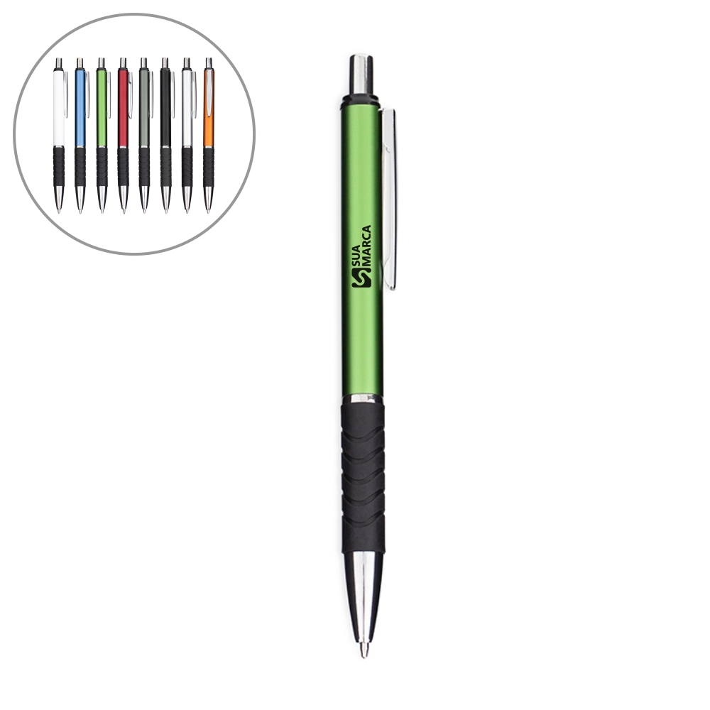 Caneta metálica com detalhe emborrachado próximo à ponta. Conta com acionamento por clique e carga esferográfica azul de 1.0mm.