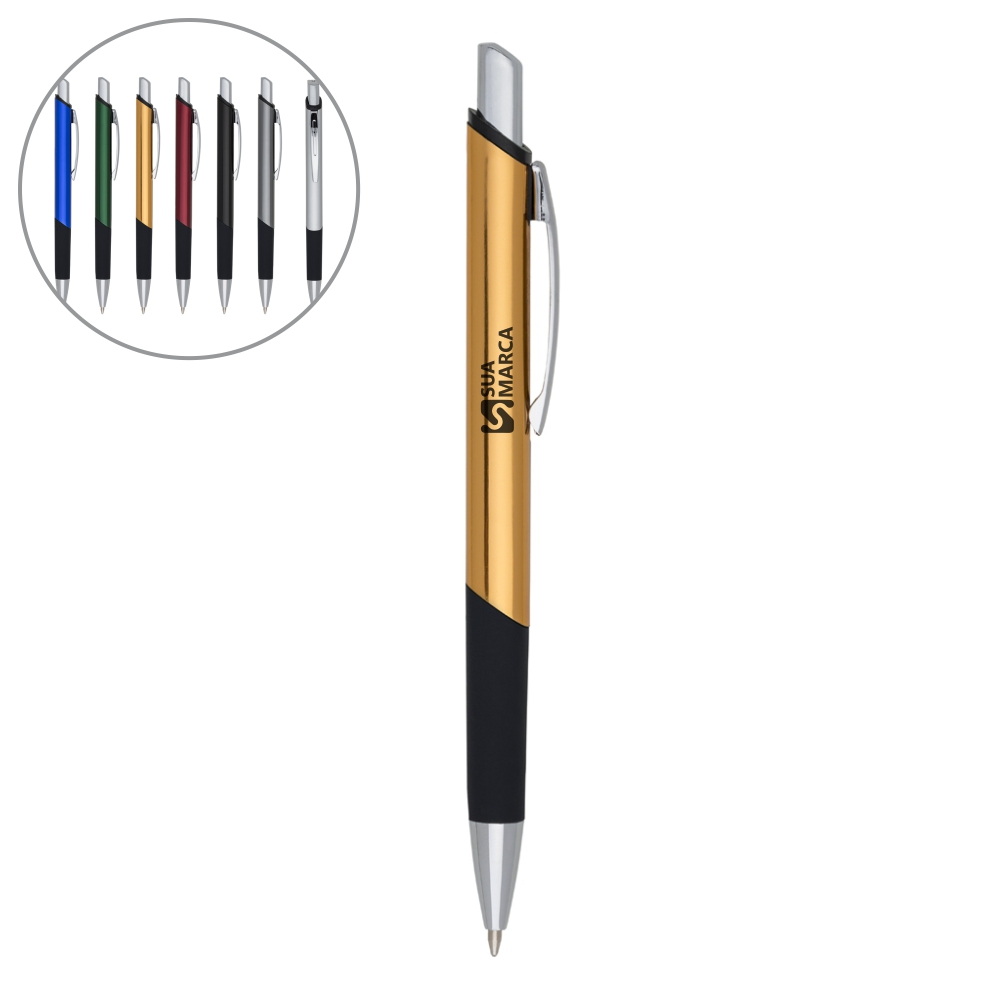 Descrição: Caneta metálica com design quadrangular, acabamento brilhante (exceto a prata) e detalhe emborrachado, carga esferográfica azul e acionamento por clique.