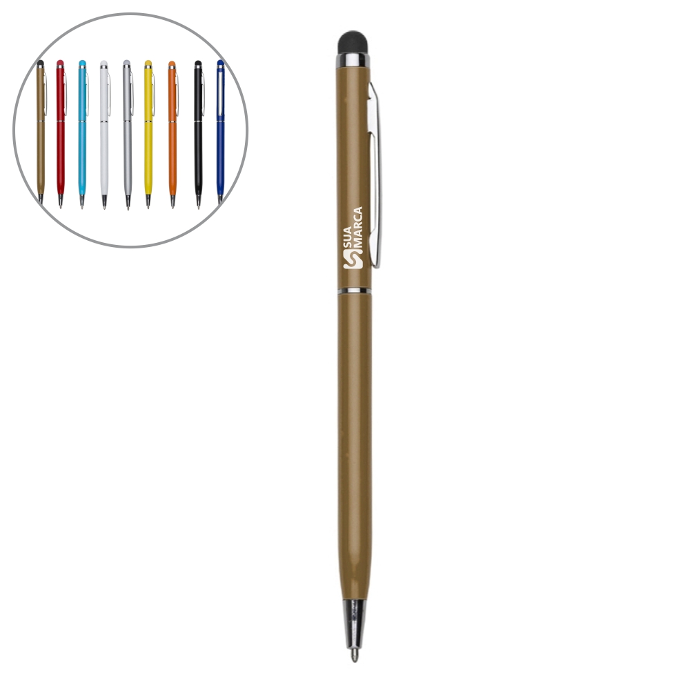 Descrição: Caneta metálica com touch screen, carga esferográfica azul e acionamento por rotação.