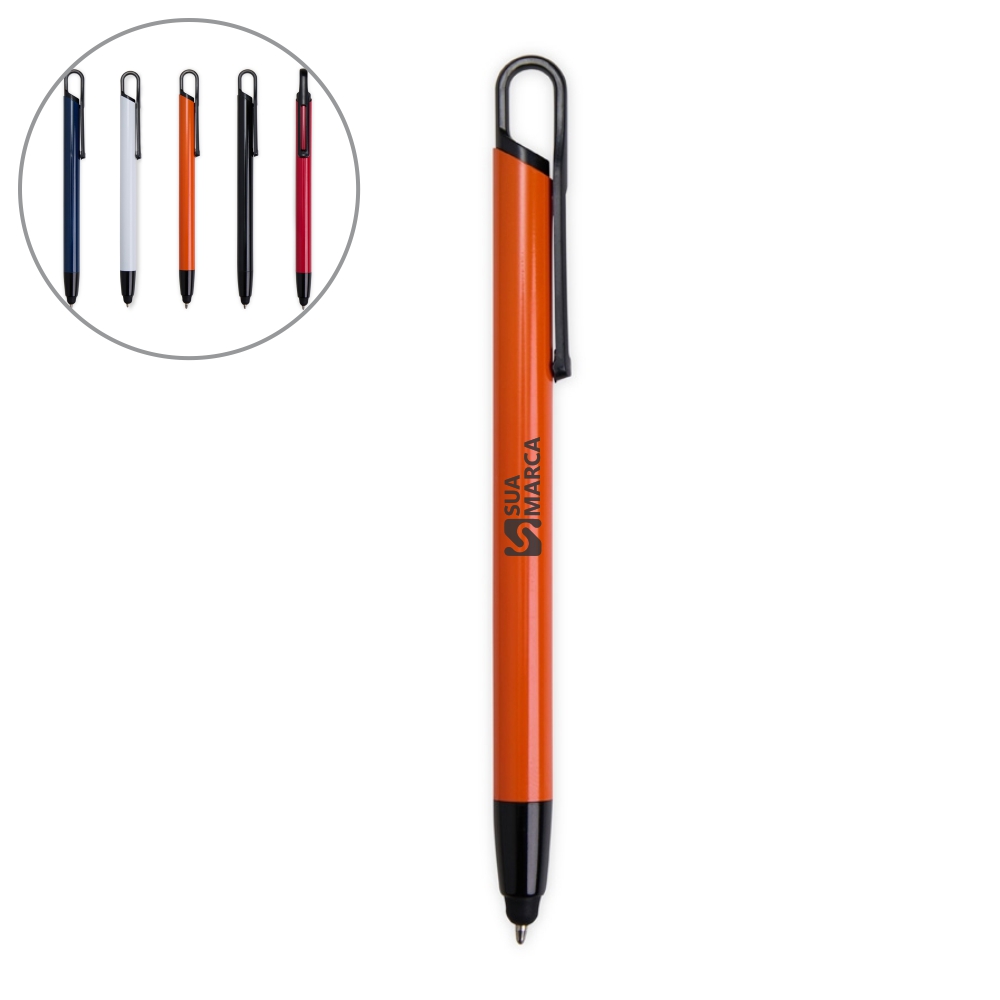 Descrição: Caneta metálica com clipe plástico e ponteira touch, carga esferográfica azul 1.0mm e acionamento por clique.