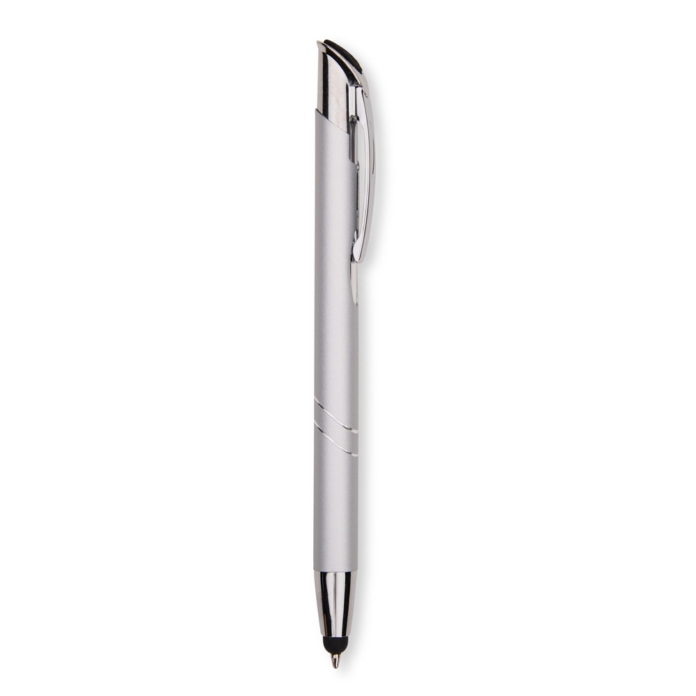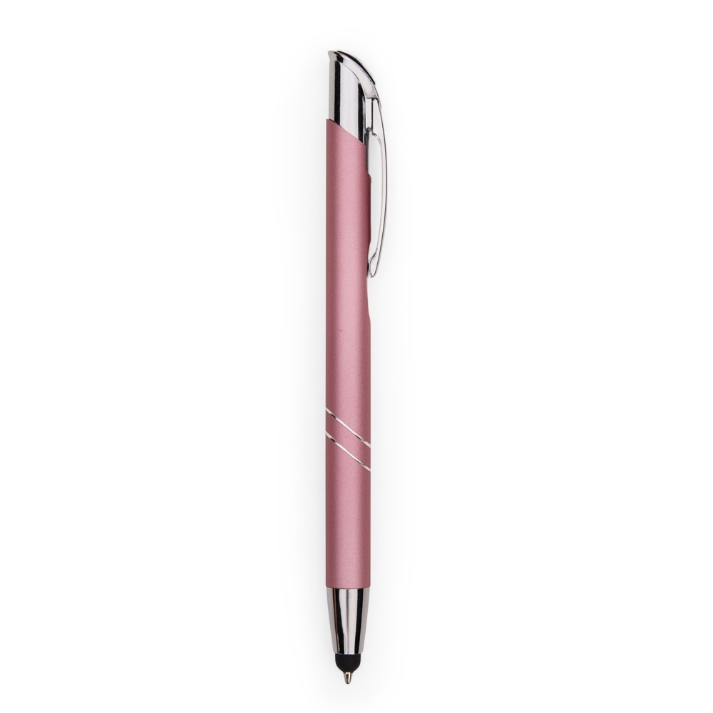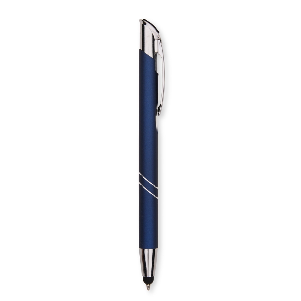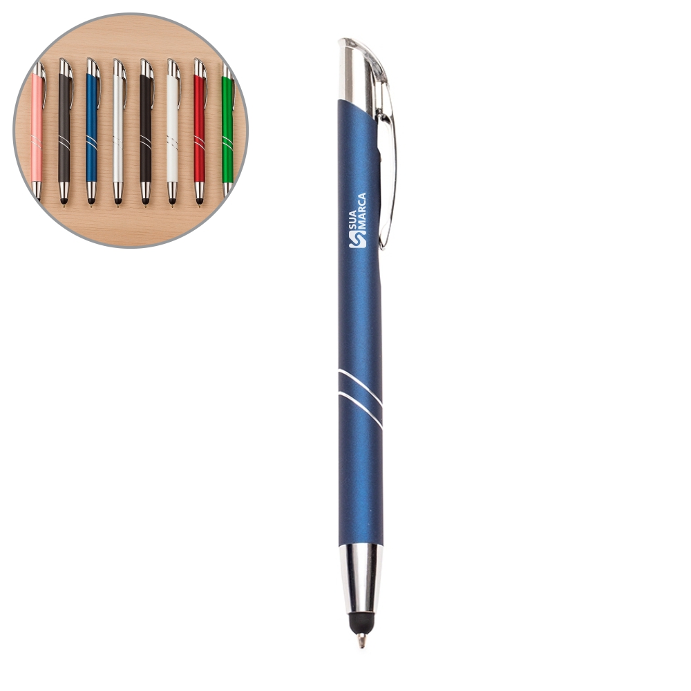 Descrição: Caneta metálica com acionamento por clique texturizado e carga esferográfica azul de 1,0 mm. Possui ponta com revestimento emborrachado para uso em telas sensíveis ao toque.