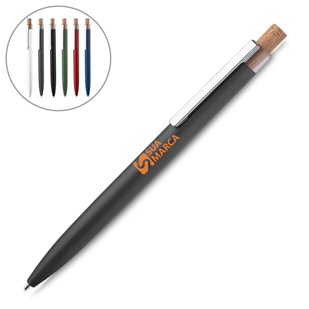 Caneta esferográfica em alumínio reciclável com escrita em azul. Refil parker e acionador em bambu.Dimensão Produto:14,5xø1,0cmPeso do Produto:0,018kg