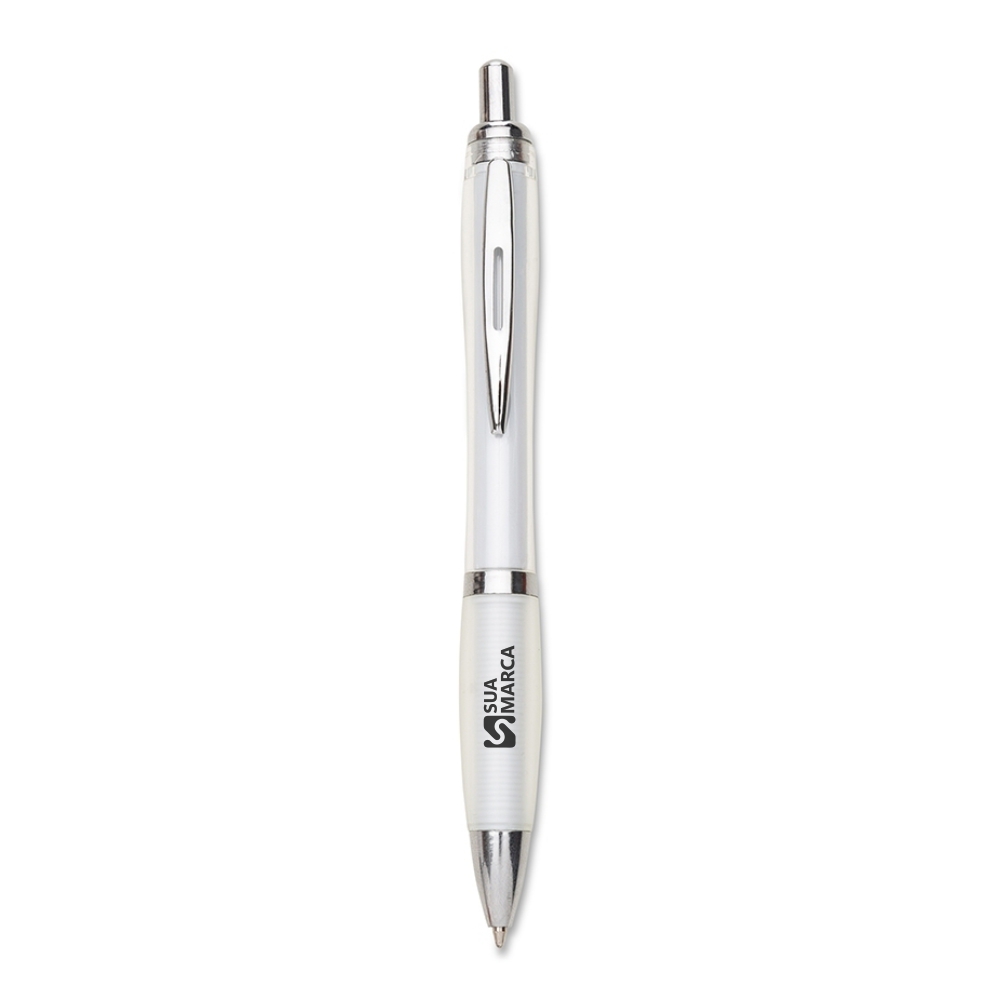 Caneta plástica com “carcaça” transparente” e parte interna branca. Clip de metal, aciona por clique.