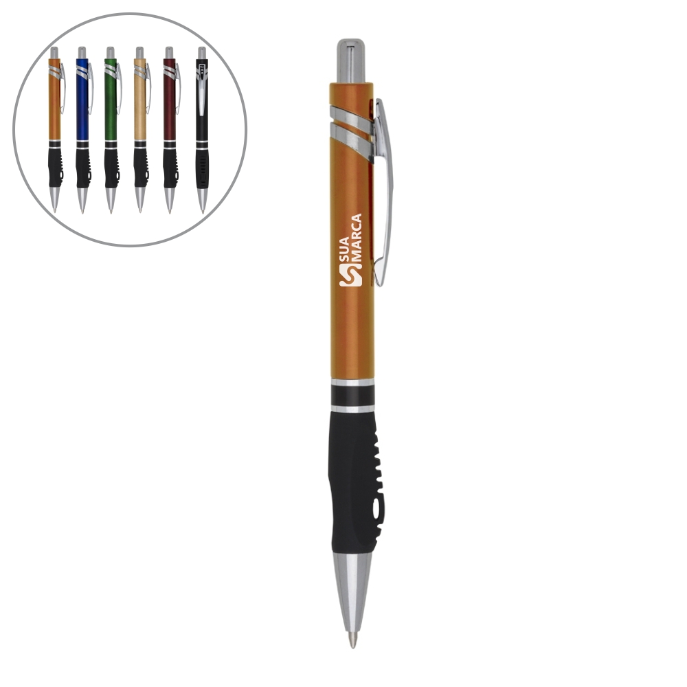 Caneta plástica inteira colorida com detalhes em prata. Clip de metal, possui anel preto e parte inferior emborrachada com relevo. Aciona por clique.