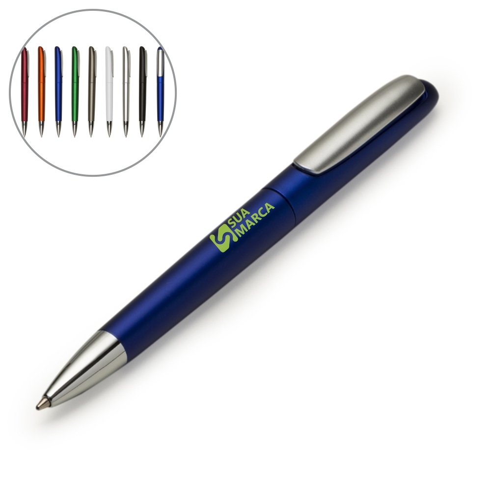 Caneta plástica inteira colorida com detalhes prata. Acionador é o próprio clip plástico, basta apertar parte inferior dele para utilizar a esferográfica e apertar a parte superior do clip pra guardá-la.