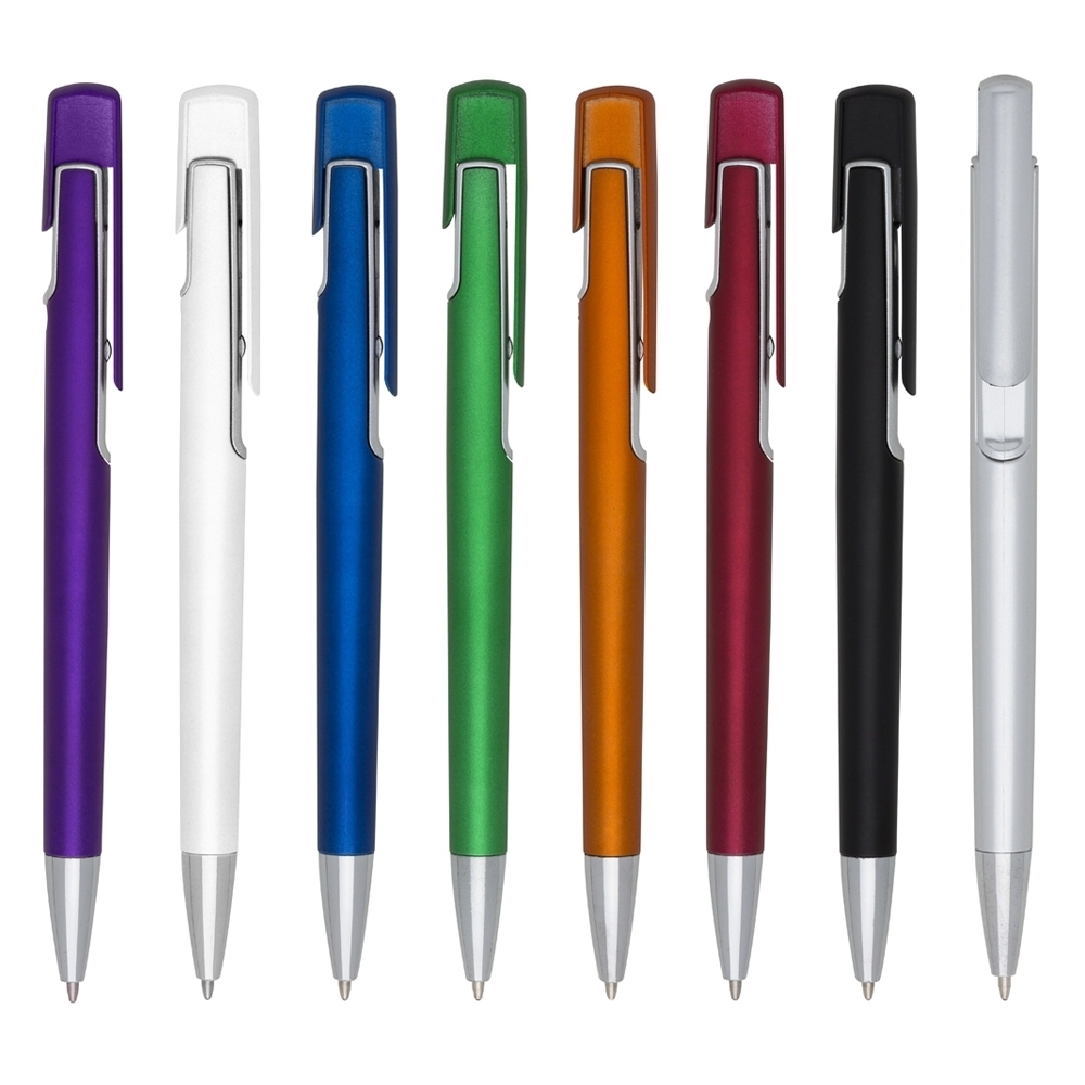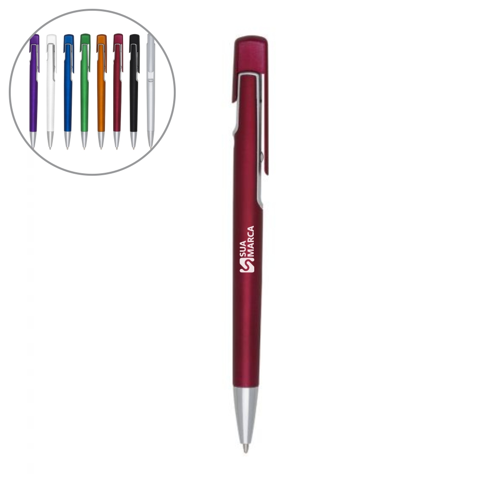 Caneta plástica inteira colorida com detalhes em prata. Possui um clip com design espaçoso ideal para gravação, aciona por clique.