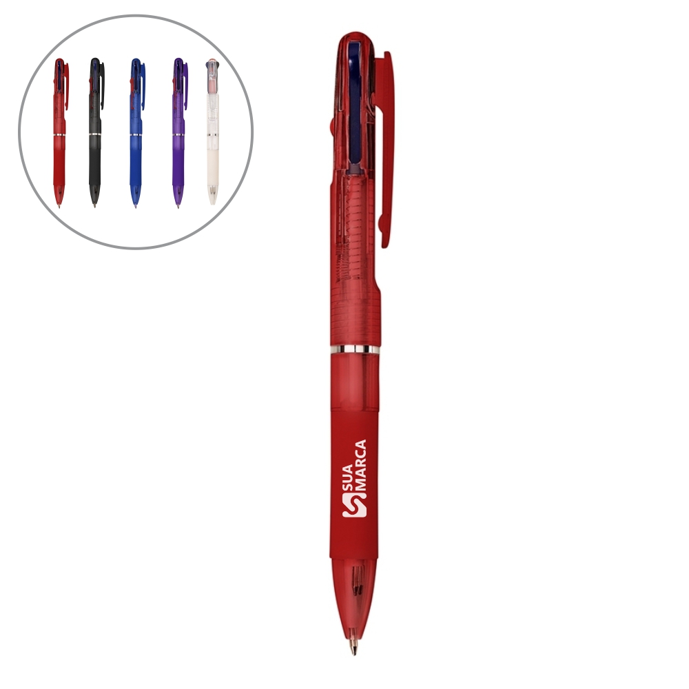 Caneta plástica de 3 cores (cargas: azul, preto e vermelho) com anel central prata e borracha colorida. Para acionar a cor desejada basta “descer o botão” com a cor respectiva, para destravar pressione outra cor.