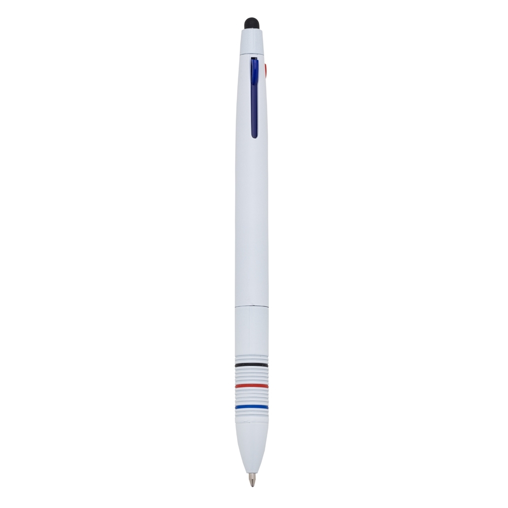 Caneta plástica três cores e ponteira touch, corpo branco com detalhes coloridos. Possui as cargas azul, preto e vermelho (basta descer o suporte colorido pra acionar a cor). Clip plástico e touch superior, possui anéis preto, vermelho e azul na parte inferior em relevo.