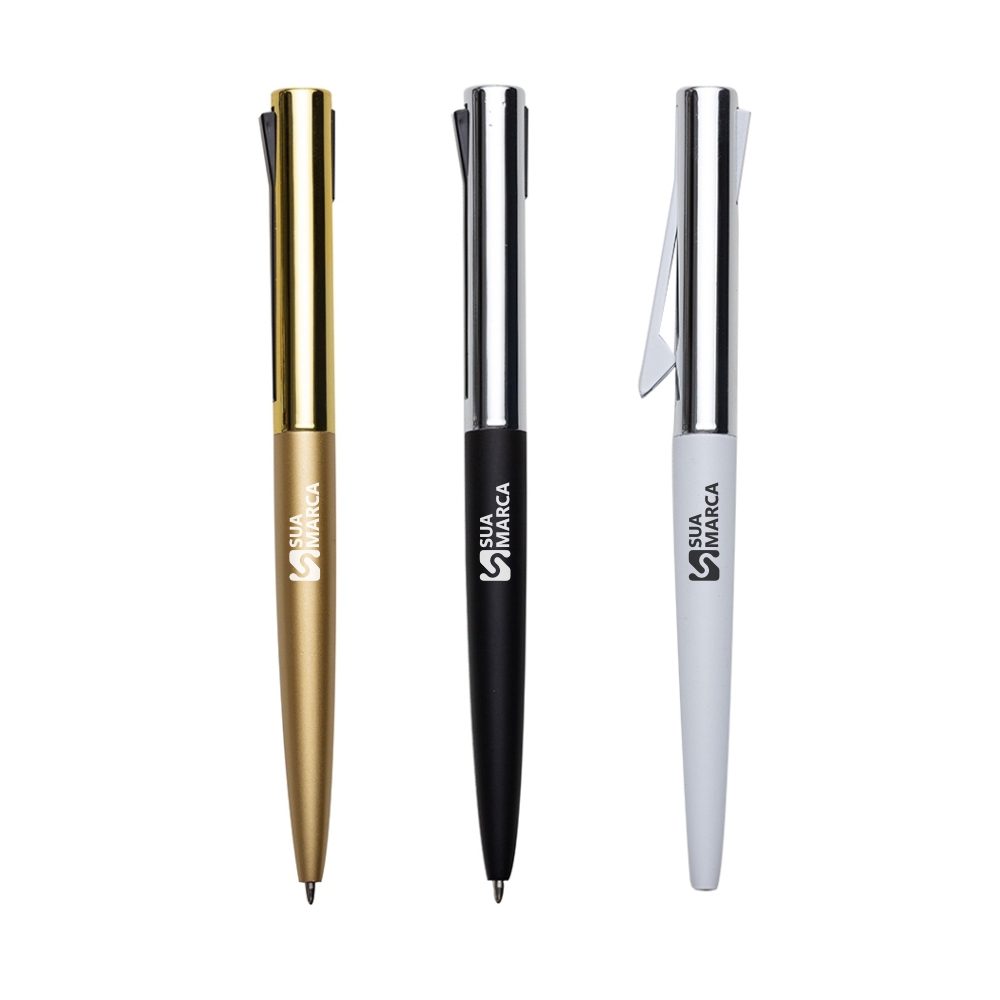 Caneta semimetal com parte superior brilhante e parte inferior fosca. Clip preto metálico, para acioná-lo basta pressionar sua parte inferior e para voltar ao normal pressionar sua parte superior.