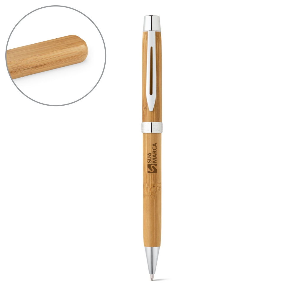 Esferográfica em bambu com mecanismo twist e clipe em metal. Fornecida em estojo de bambu. Esferográfica amiga do ambiente. ø11 x 140 mm | Estojo: 170 x 40 x 25 mm.
