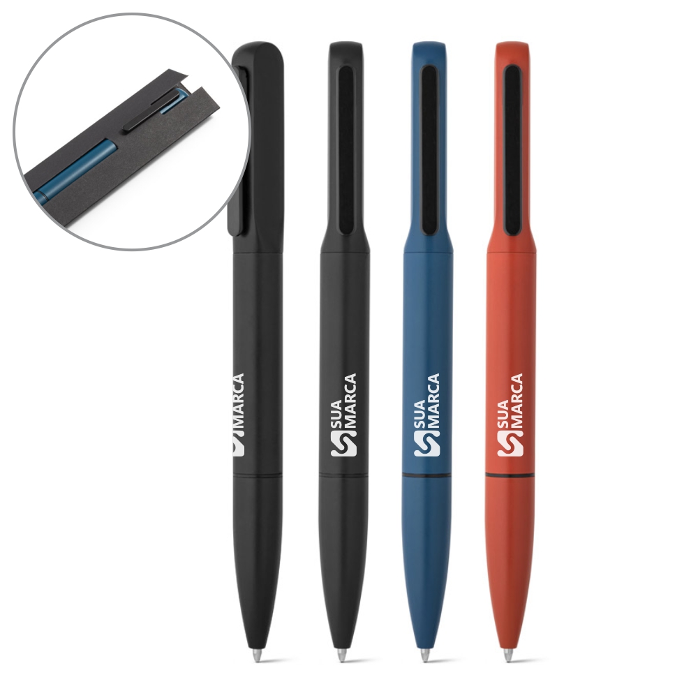 Esferográfica em alumínio 94% reciclado e escrita em azul. Quando personalizado no clipe permite que ao ser rodado ilumine o seu logotipo ou personalização. Fornecida em bolsa de oferta. ø12 x 140 mm