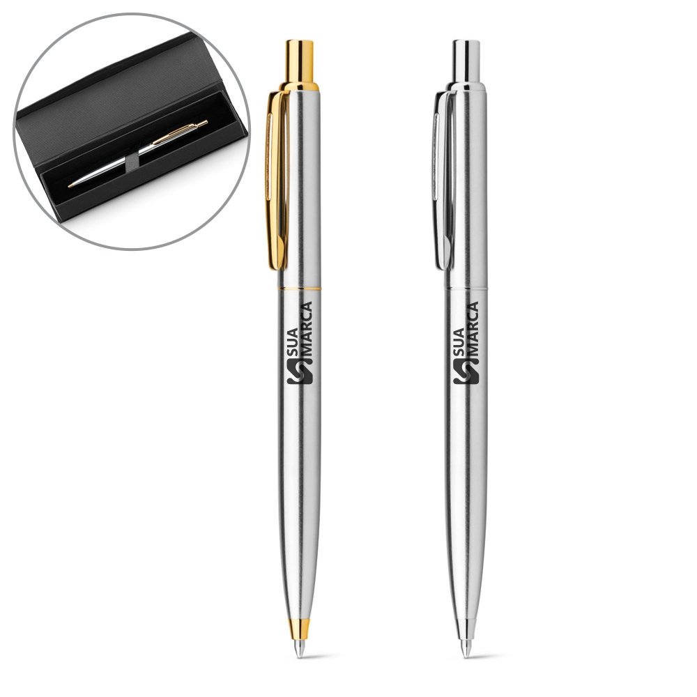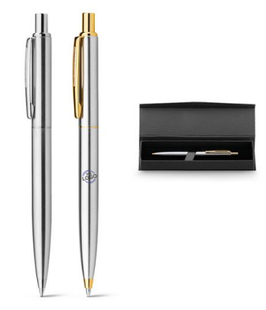 Esferográfica em metal com corpo brilhante e clipe. Fornecida Fornecida em estojo almofadado. ø10 x 131 mm | Caixa: 182 x 22 x 42 mm.