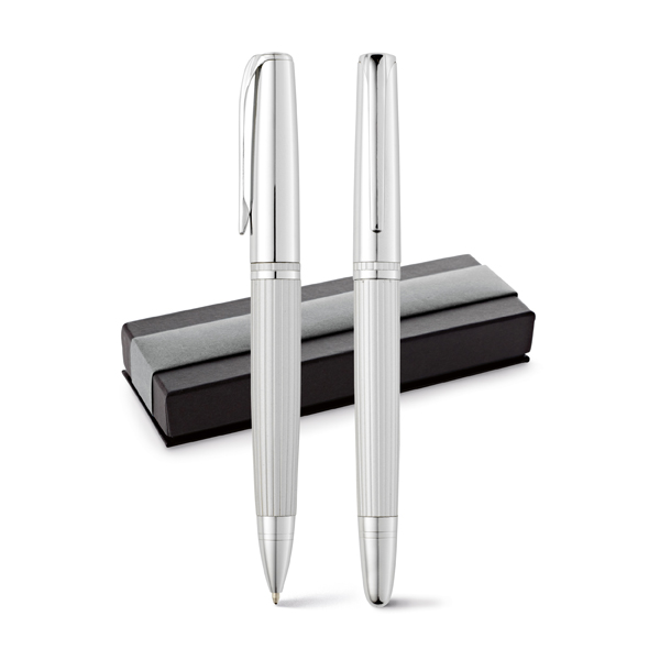 Conjunto de roller e esferográfica. Metal. Esferográfica: 1,5km de escrita. Em estojo almofadado. Roller: ø12 x 136 mm | Esferográfica: ø12 x 132 mm | Estojo: 174 x 64 x 26 mm