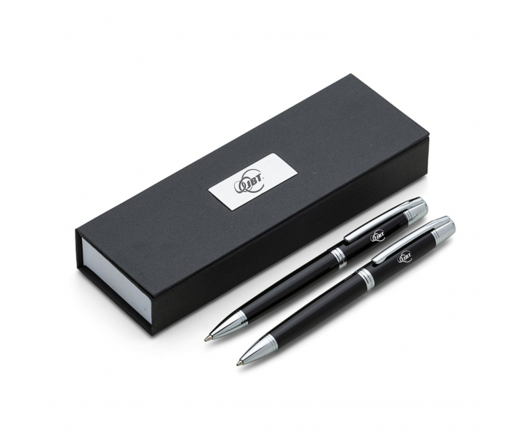 Descrição: Conjunto caneta e lapiseira em estojo de cartonagem com placa central para personalização. Clip metal com dois anéis em relevo, anel centralizado e dois anéis em relevo na ponteira e acionam por giro. Estojo revestida com espuma na parte interna.