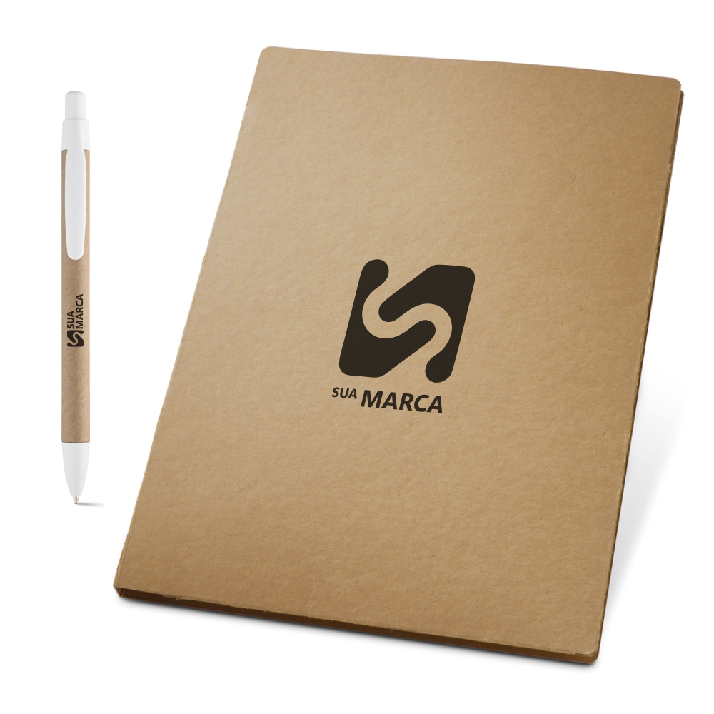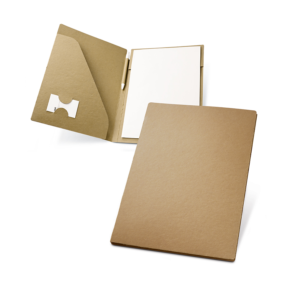 Pasta A4. Cartão: 450 g/m². Bloco: 20 folhas não pautadas de papel reciclado. Incluso esferográfica. 230 x 320 x 15 mm. Escrita a azul.