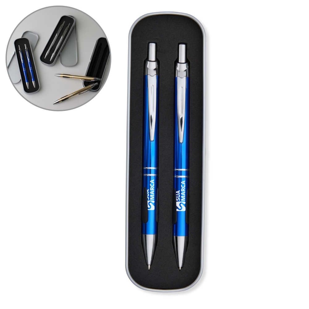 Descrição: Conjunto de caneta e lapiseira metálicas em estojo de metal. Caneta e lapiseira possuem acabamento fosco, detalhe emborrachado na parte inferior, carga esferográfica azul de 1.0mm e acionamento por clique. Estojo revestido de veludo interno.
