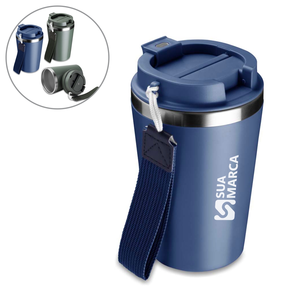 Copo de 350 ml com parede dupla, interior em inox 304 e exterior em plástico PP, tampa em plástico PP, alça de mão e acabamento com pintura fosca.