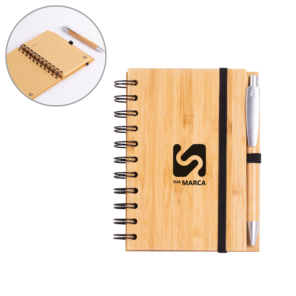 1 Caderno de anotações 14 x 9cm capa de bambu com elástico, suporte para canetas e miolo com 60 folhas pautadas na cor bege;