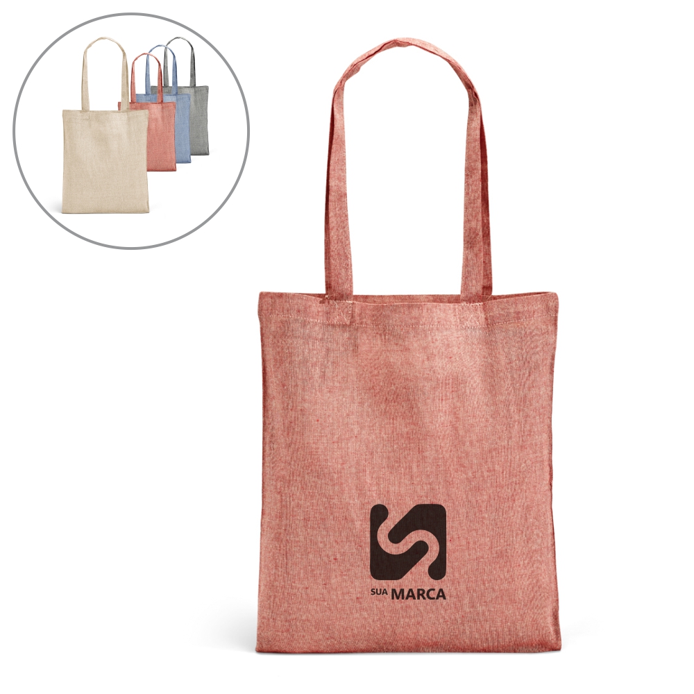 Sacola. Algodão reciclado: 150 g/m². Alças de 65 cm. 375 x 415 mm.