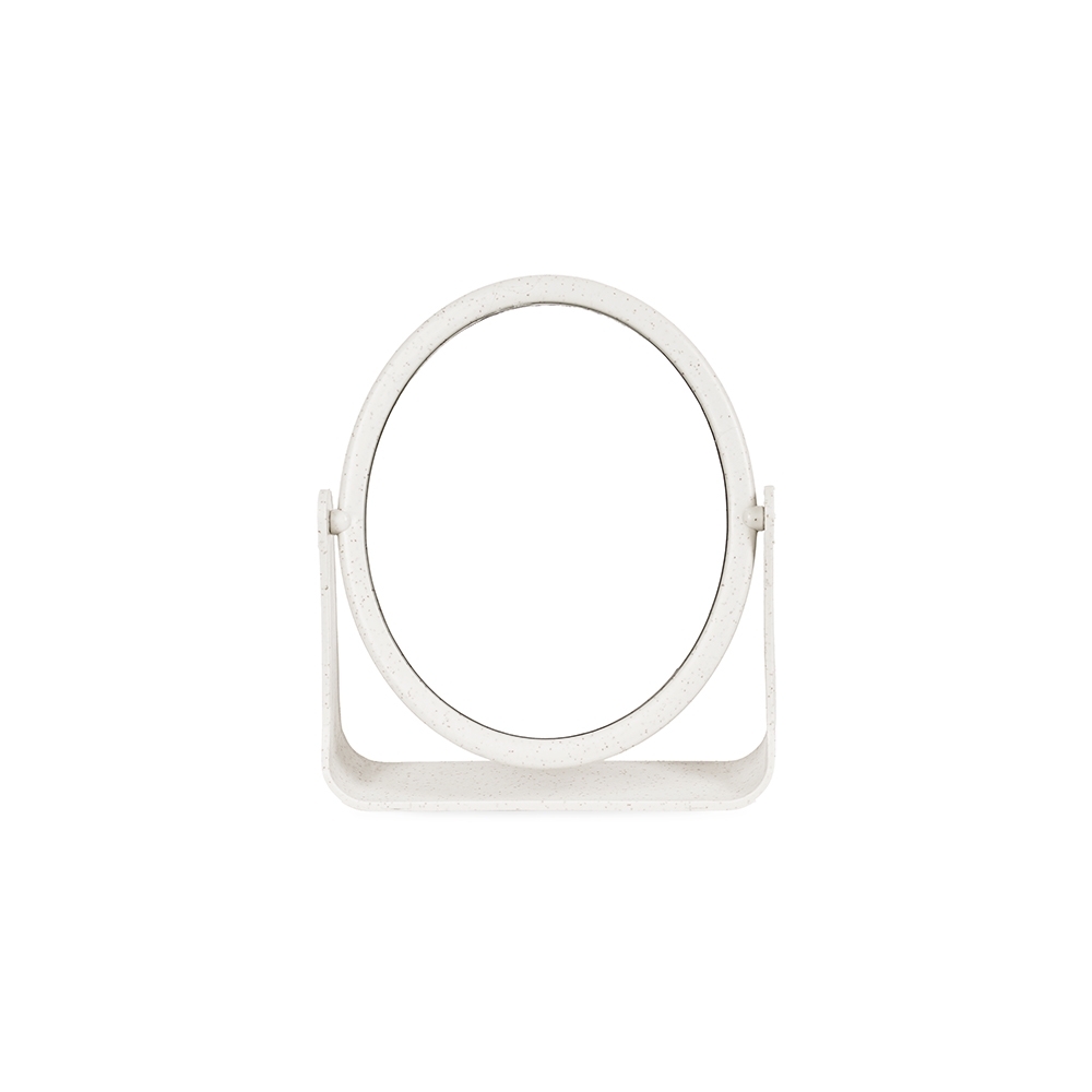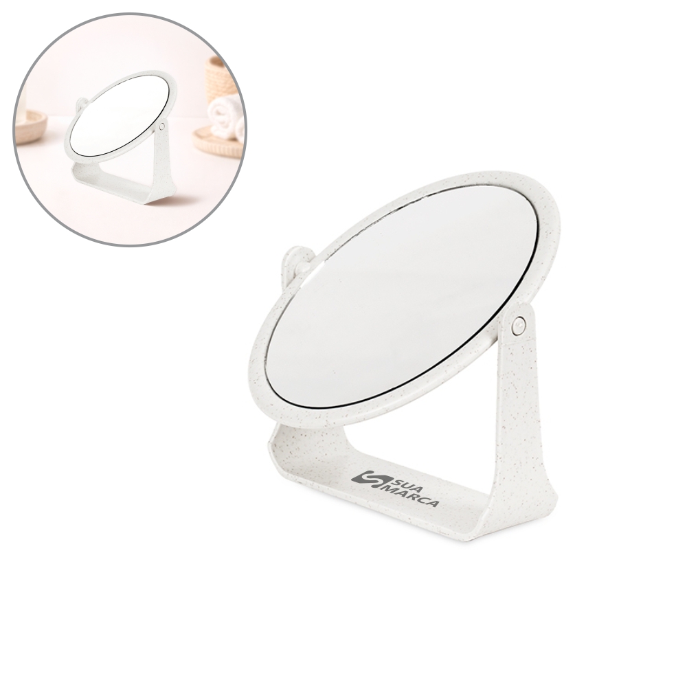 Espelho de mesa oval dupla face, sem aumento, com moldura e base em plástico polipropileno (PP).