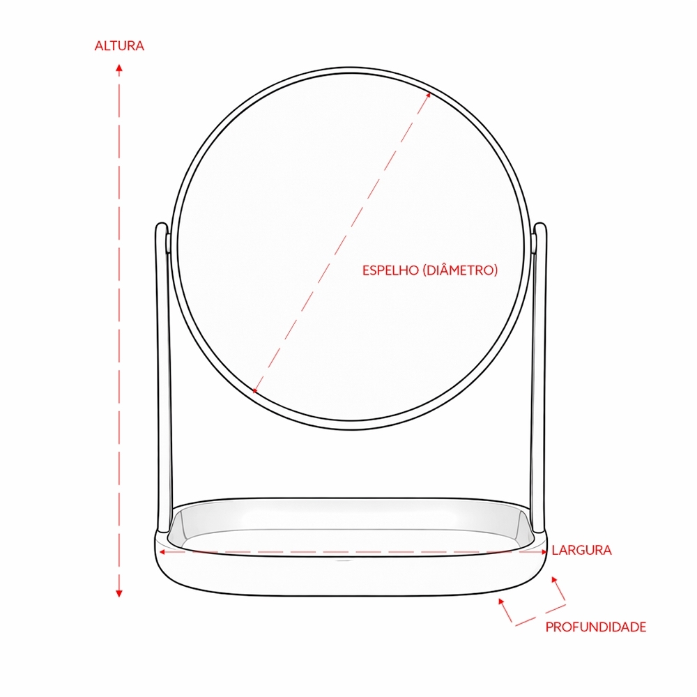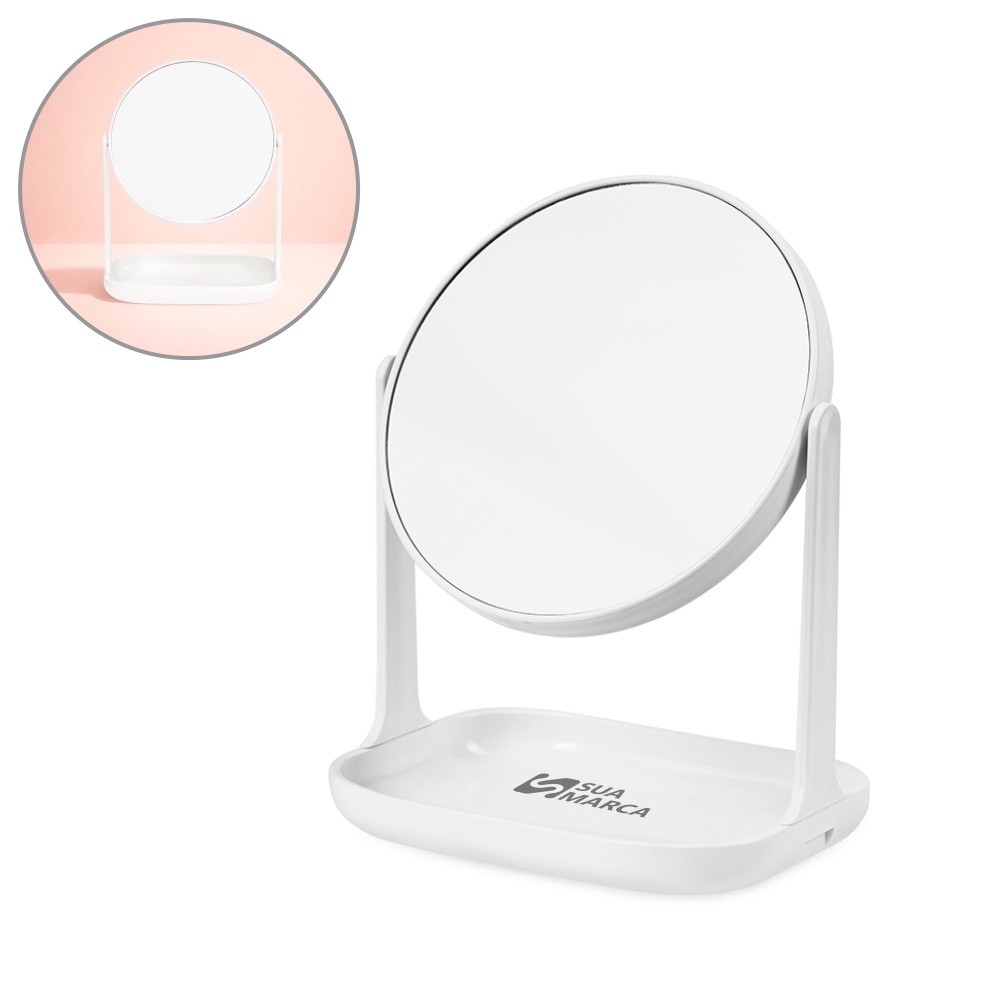 Espelho de mesa giratório dupla face sem aumento e estrutura feita em plástico. Possui base com espaço para organizar objetos pequenos.