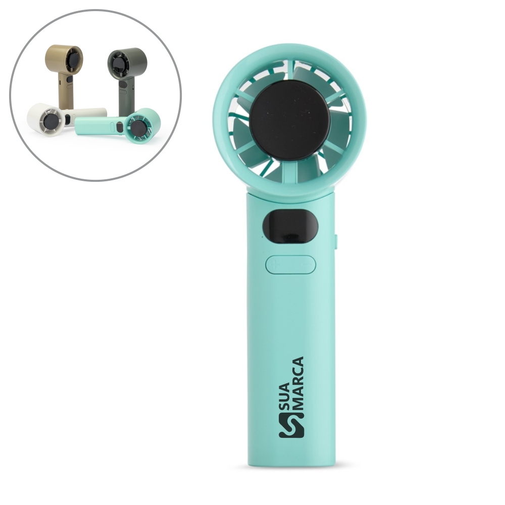 Mini ventilador recarregável em plástico e metal. Possui controle de velocidade ajustado por botões frontais, acionamento por chave seletora e painel de LED que exibe níveis de velocidade e carga da bateria. Acompanha cabo USB-C e cordão em nylon.