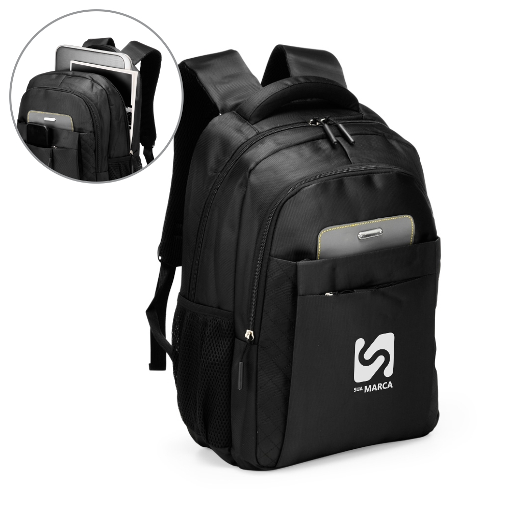 Descrição: Mochila confeccionada em Jacquard 260 g/m² resistente à água, com detalhes em metal e couro sintético, fechamento em zíper com puxadores plásticos e capacidade de até 22 litros. Apresenta compartimento interno com divisória para notebooks de até 15,3 polegadas. Possui quatro compartimentos externos: dois bolsos frontais, um deles com divisórias internas e dois laterais abertos em tela de nylon. Dispõe ainda de alça de mão, duas alças de costas com engate para malas de viagem e costas acolchoadas em tecido respirável.