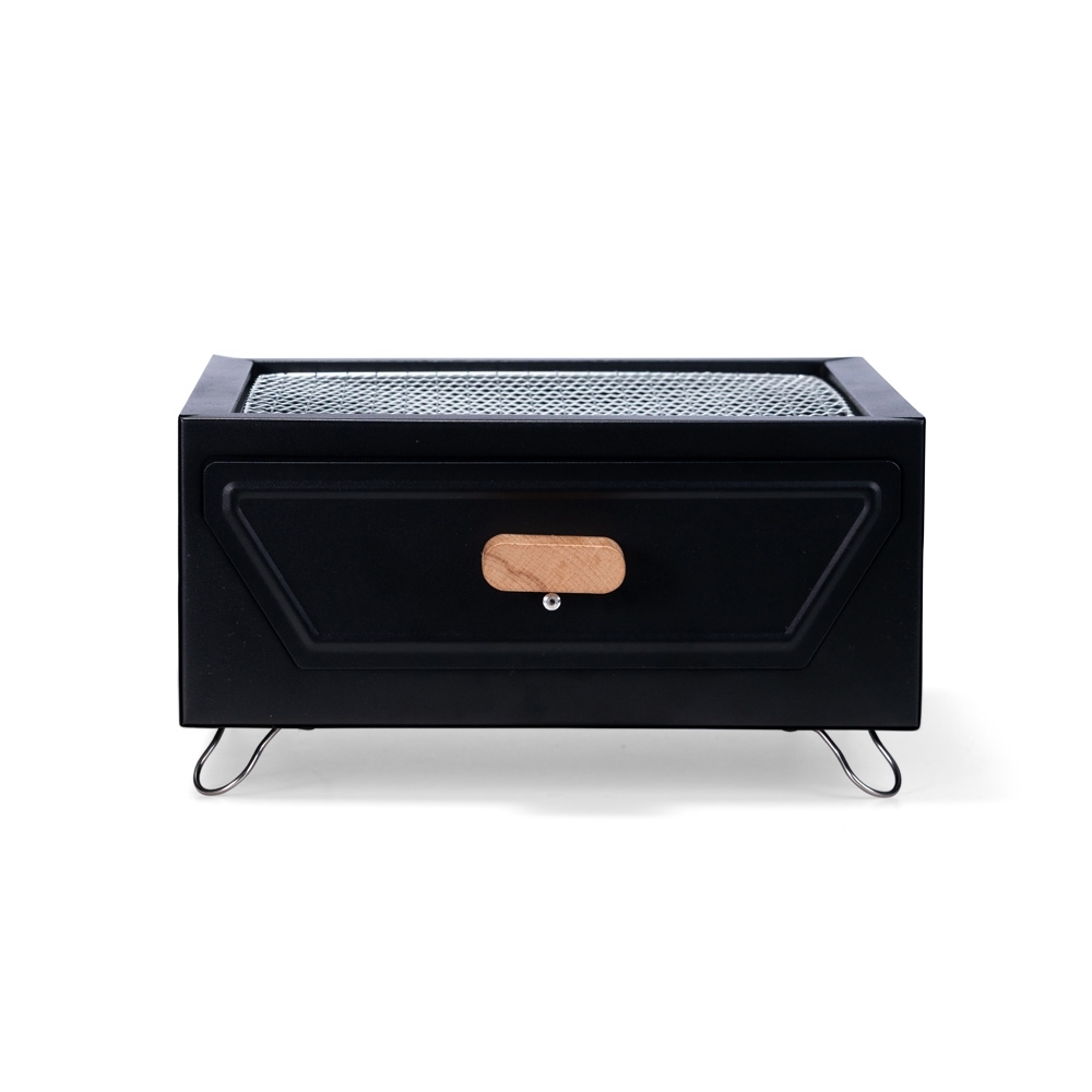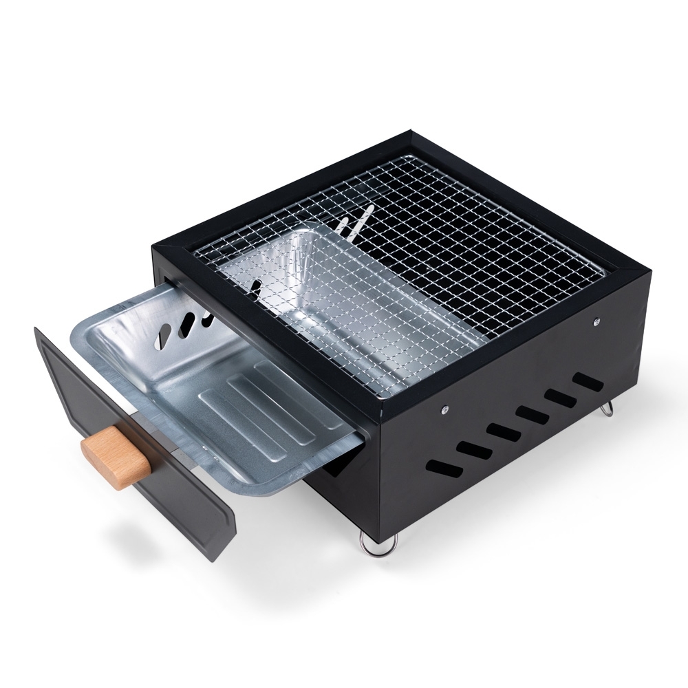 Churrasqueira portátil em ferro com pés retráteis em metal. Conta com grelha e bandeja para carvão em metal com puxador de madeira.