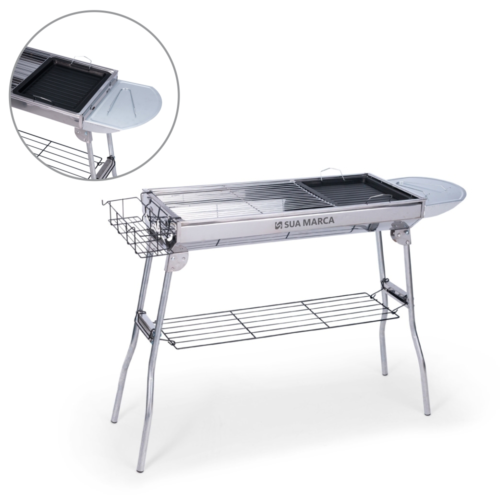 Churrasqueira dobrável em aço inoxidável. Conta com pés dobráveis com encaixes para prateleiras laterais multiuso e prateleira inferior de apoio. Possui duas grelhas para acomodação do carvão e três grelhas para encaixe na parte superior, incluindo uma em ferro com alças metálicas. Acompanha chave Phillips e parafusos para a montagem dos pés.