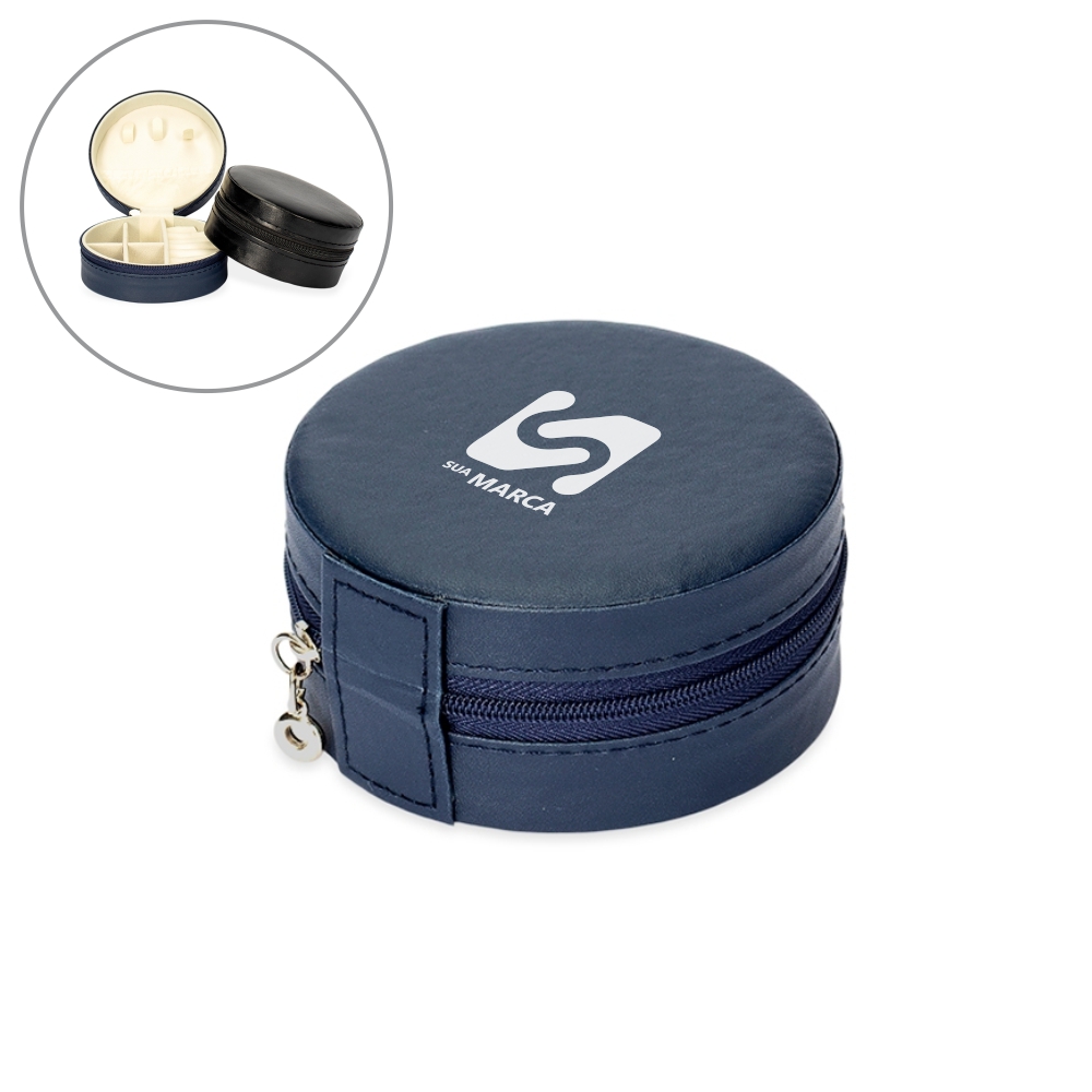Porta-joias de formato redondo em couro sintético e fechamento em zíper. Possui revestimento interno aveludado, além de três pequenos ganchos, um bolso com elástico, divisórias removíveis e almofadas fixas para abrigar anéis.