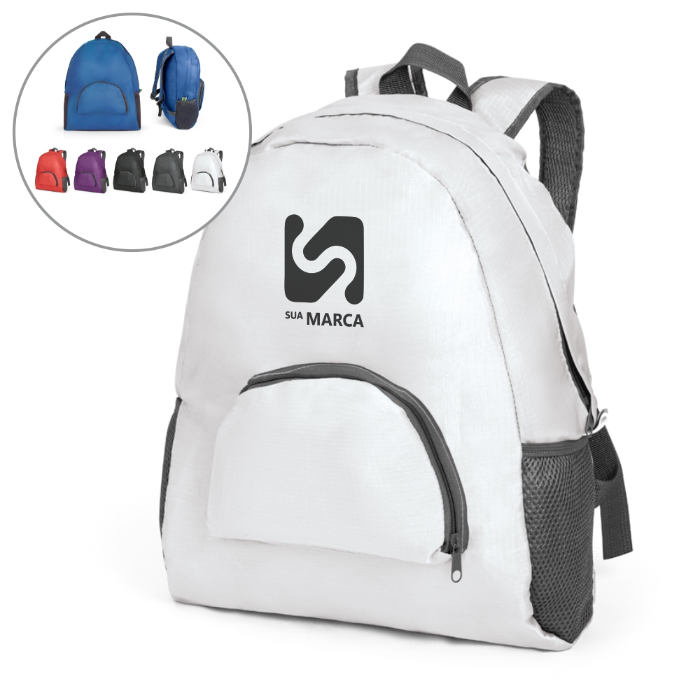 Mochila dobrável. 210D ripstop. Com bolso frontal. Dois bolsos laterais em tela. 330 x 400 x 120 mm | Dobrada: 195 x 160 x 25 mm.
