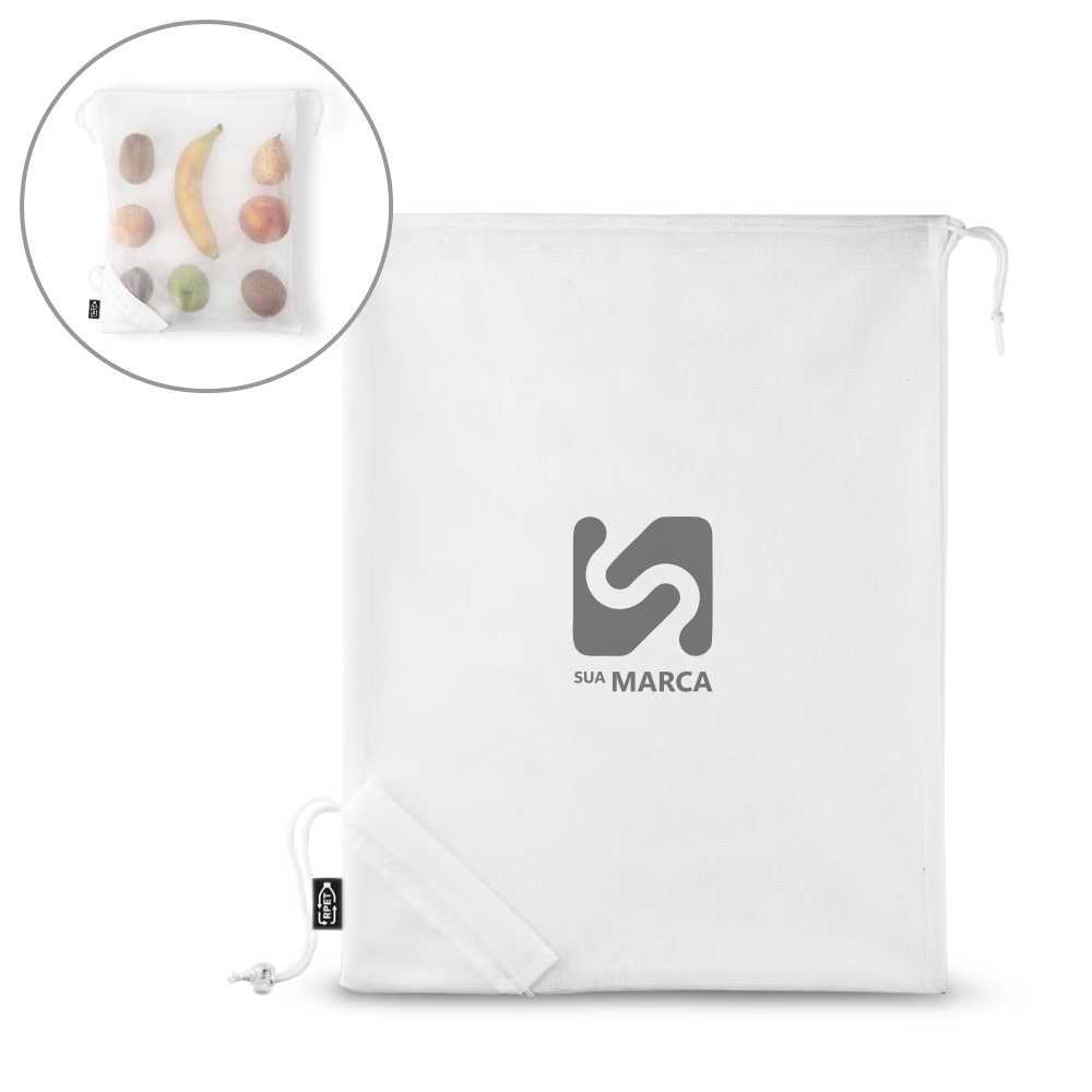 Sacola dobrável em malha rPET com bolsa em rPET 190T para dobrar a sacola. Ideal para as compras. 320 x 400 mm.