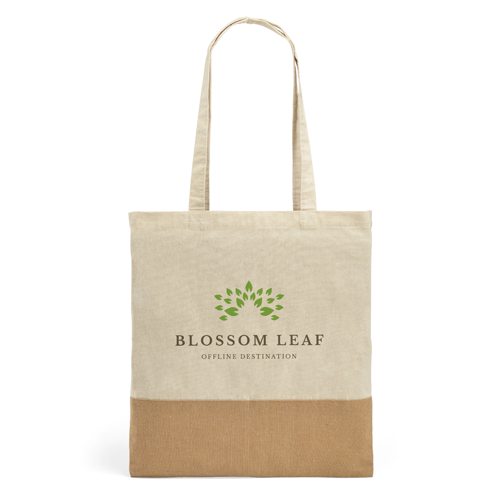 Sacola. 100% algodão: 160 g/m². Detalhe em juta. Alças de 65 cm. 375 x 415 mm.